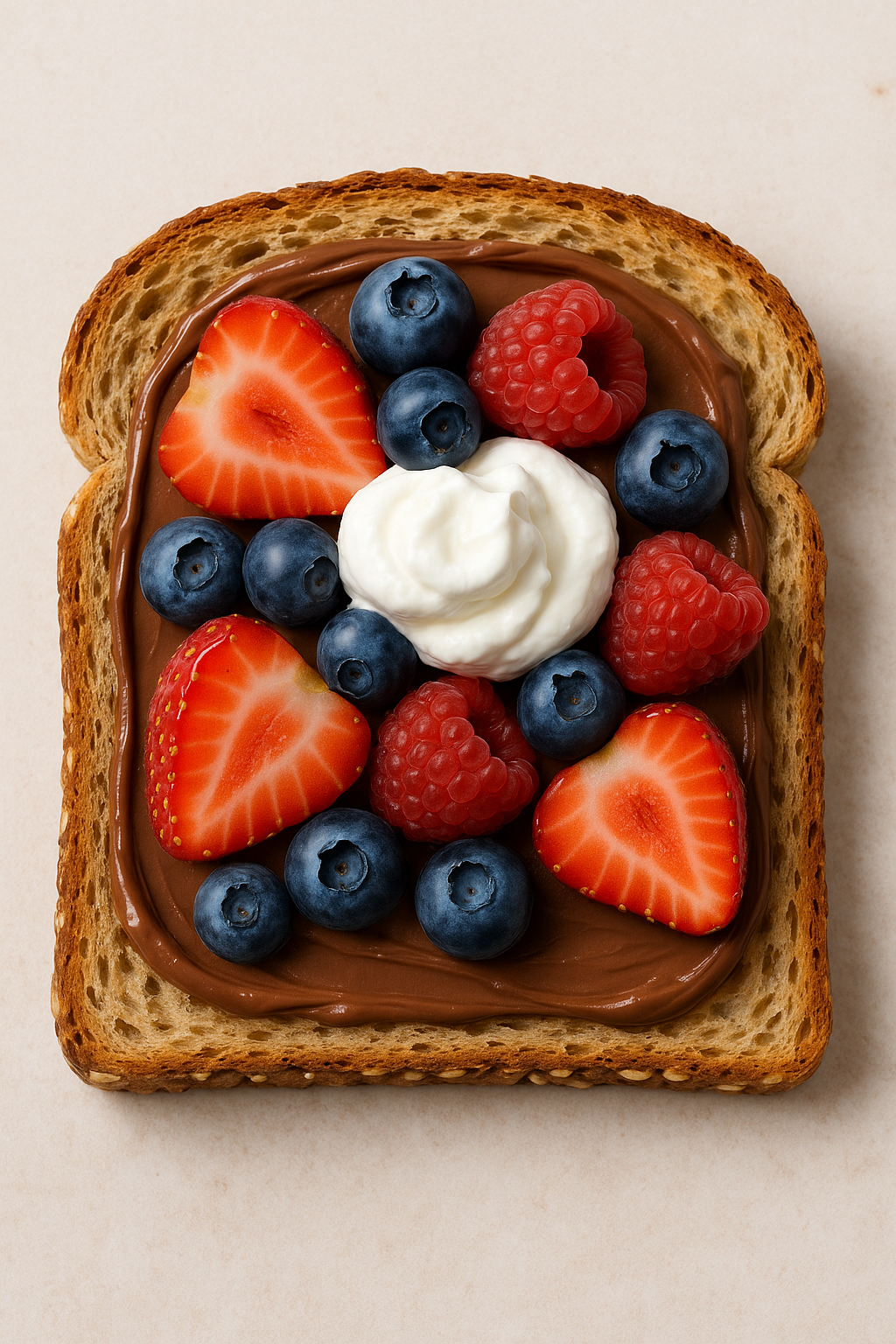 1 pieza de pan 12 granos, tostado con crema de avellanas, frutos rojos y crema batida.