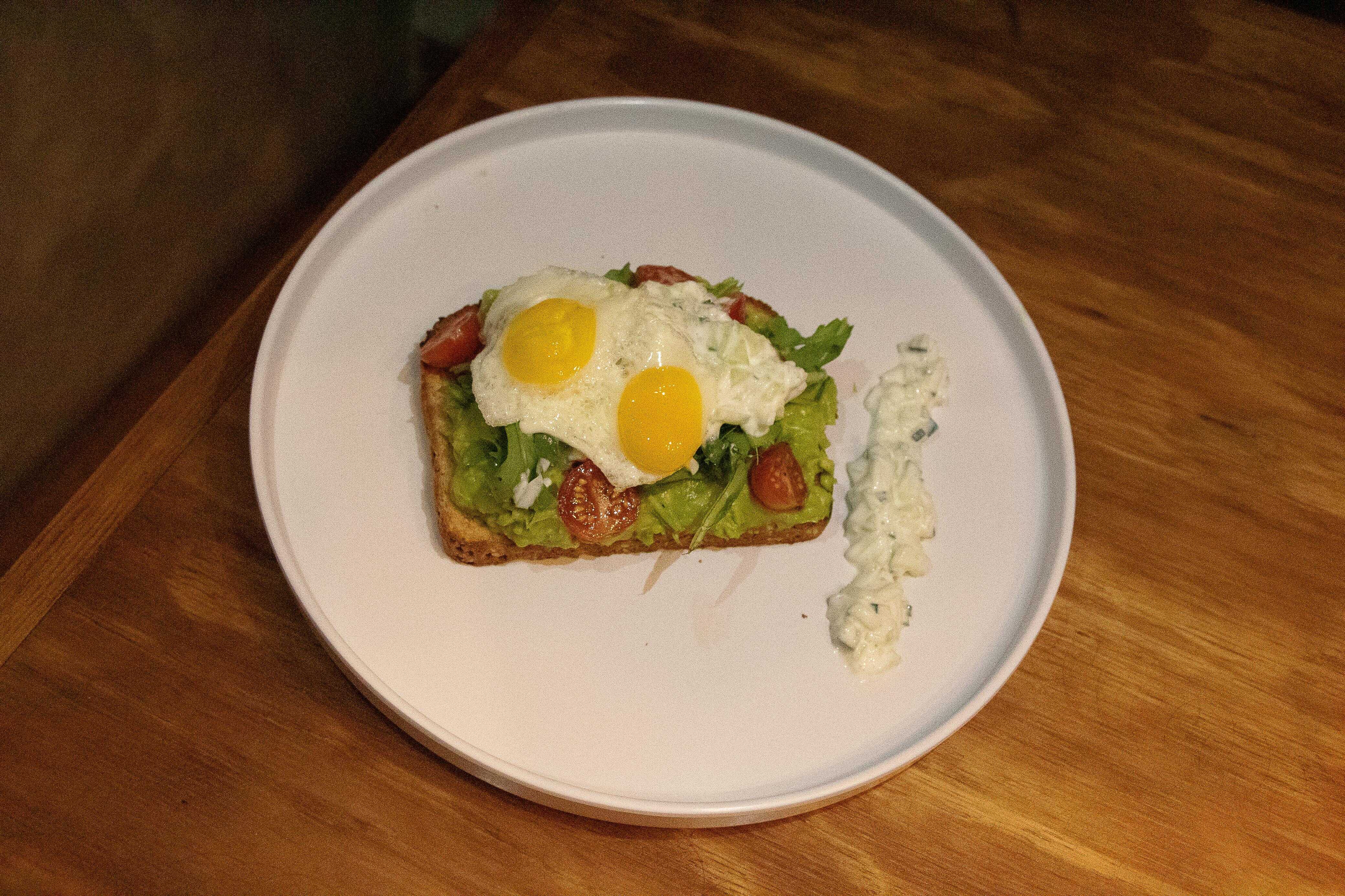 1 pieza de pan 12 granos, tostado con cremoso de aguacate, arúgula, tomates cherry y tzatziki.