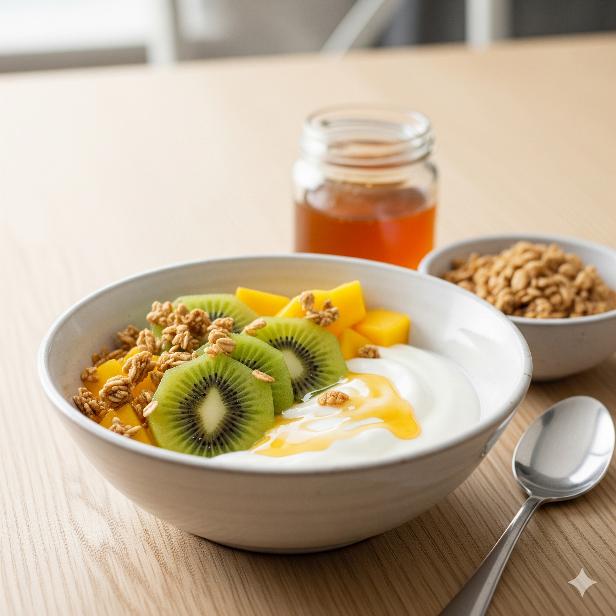 Yogurt natural con kiwi y mango, acompañado de miel y granola.