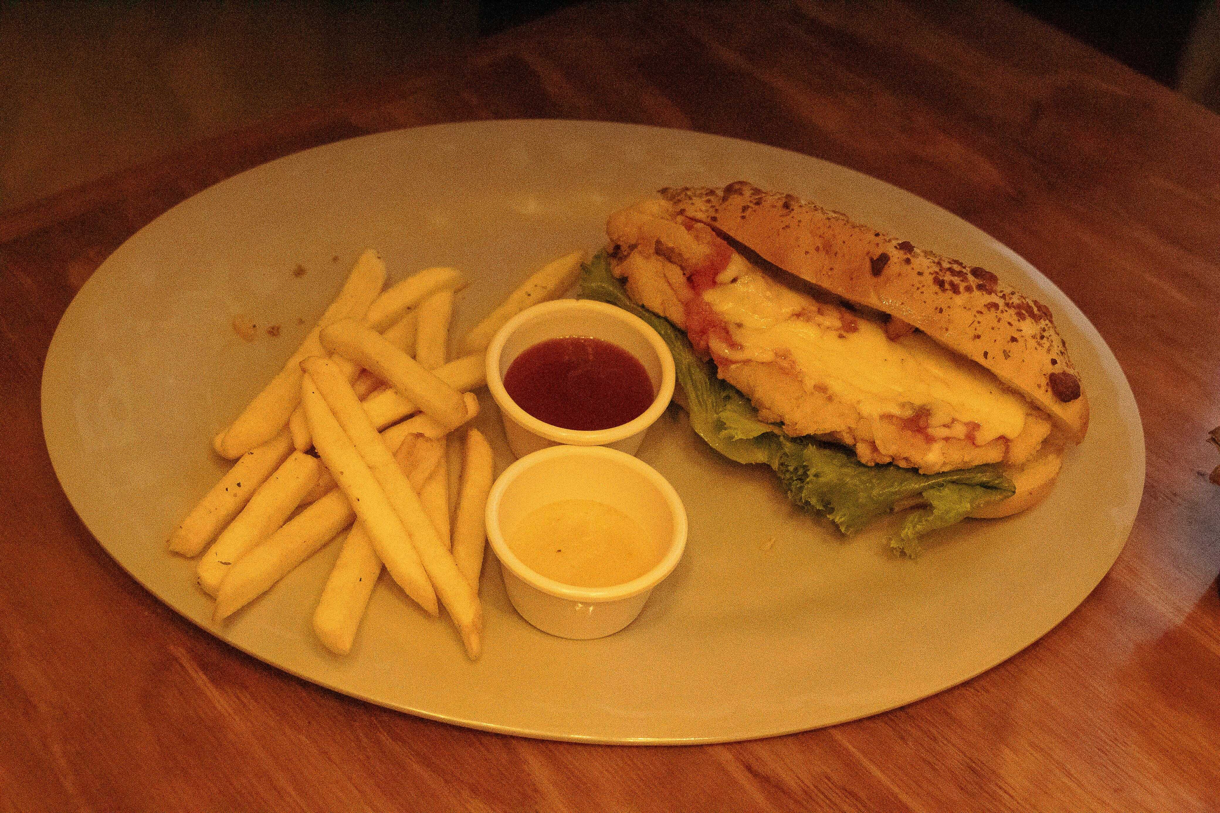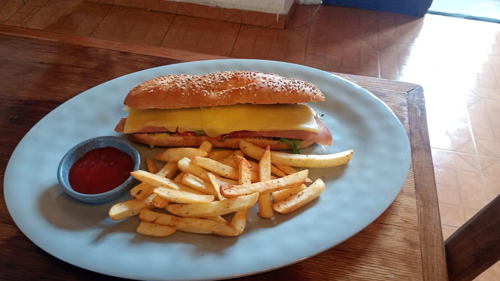 Baguette, mayonesa de la casa, pollo empanizado, sofrito de pimientos y tomate, queso manchego gratinado, acompañado de papas a la francesa o ensalada.