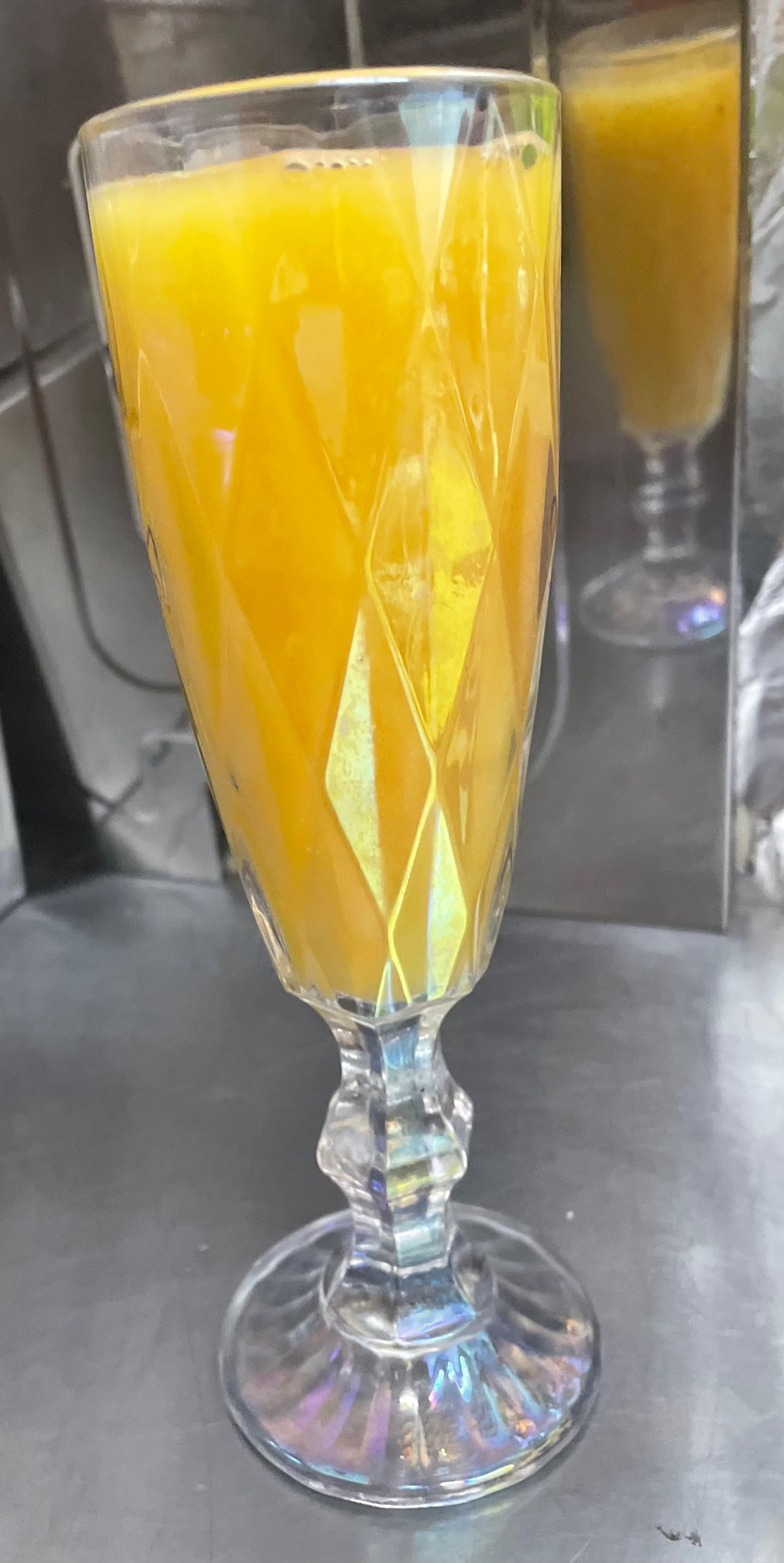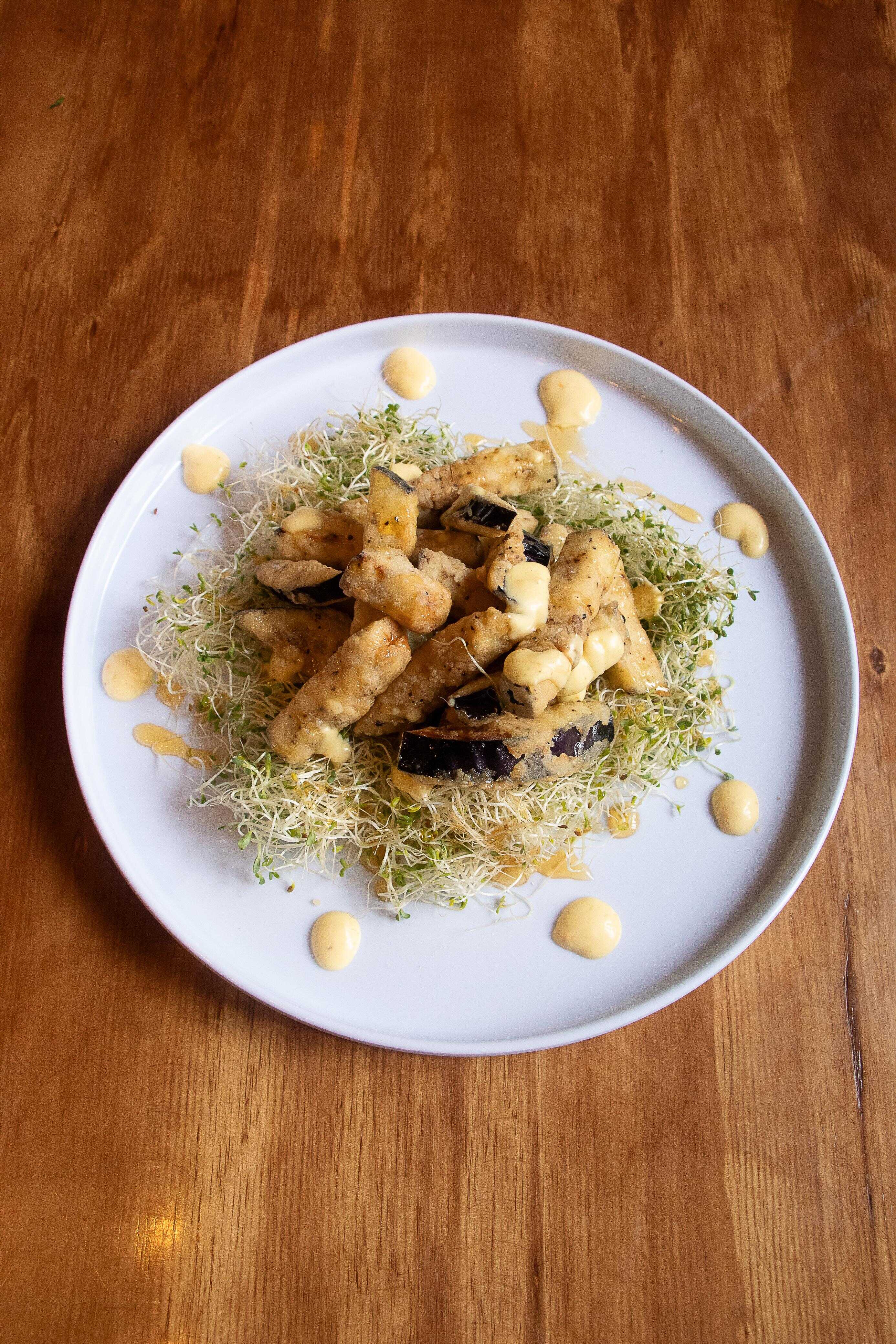 Crujientes de berenjena en una cama de germen con cremoso de mango, habanero y miel.