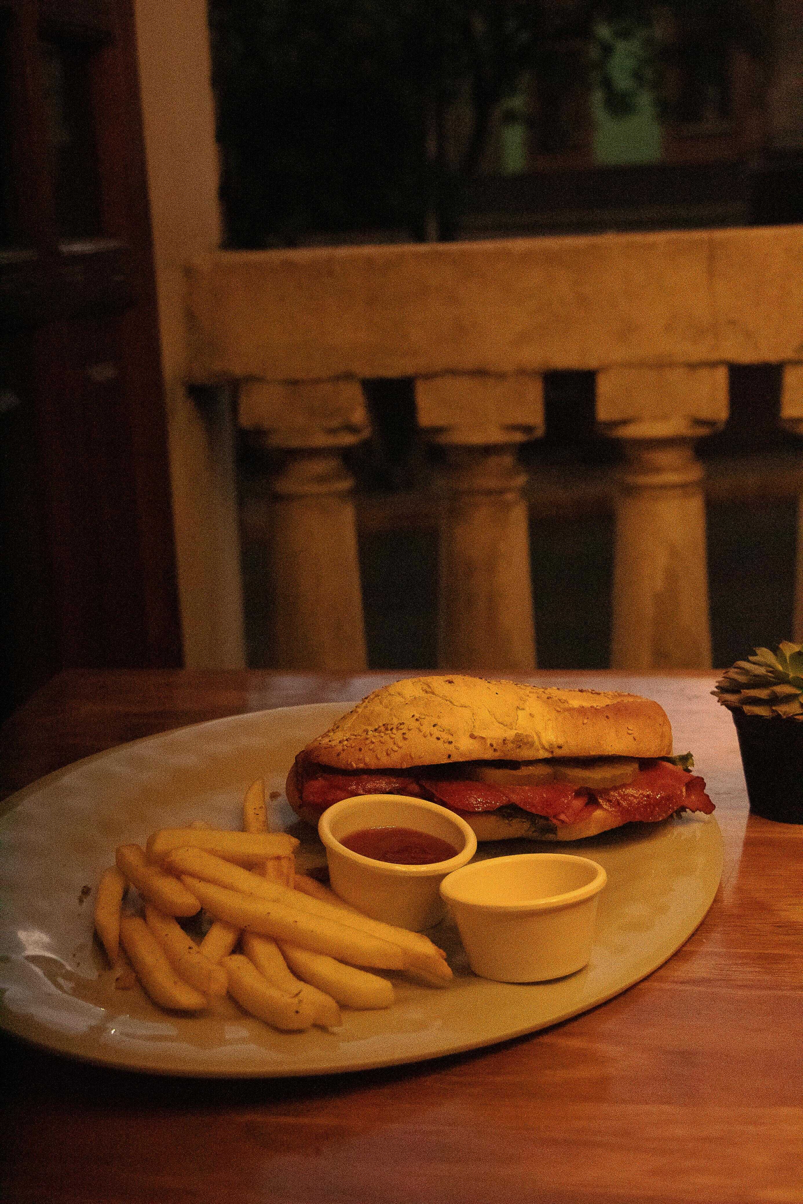 Baguette con mayonesa de chipotle, pepperoni, salami y roast beef, lechuga, tapenade y pepinillos, acompañado de papas a la francesa o ensalada.