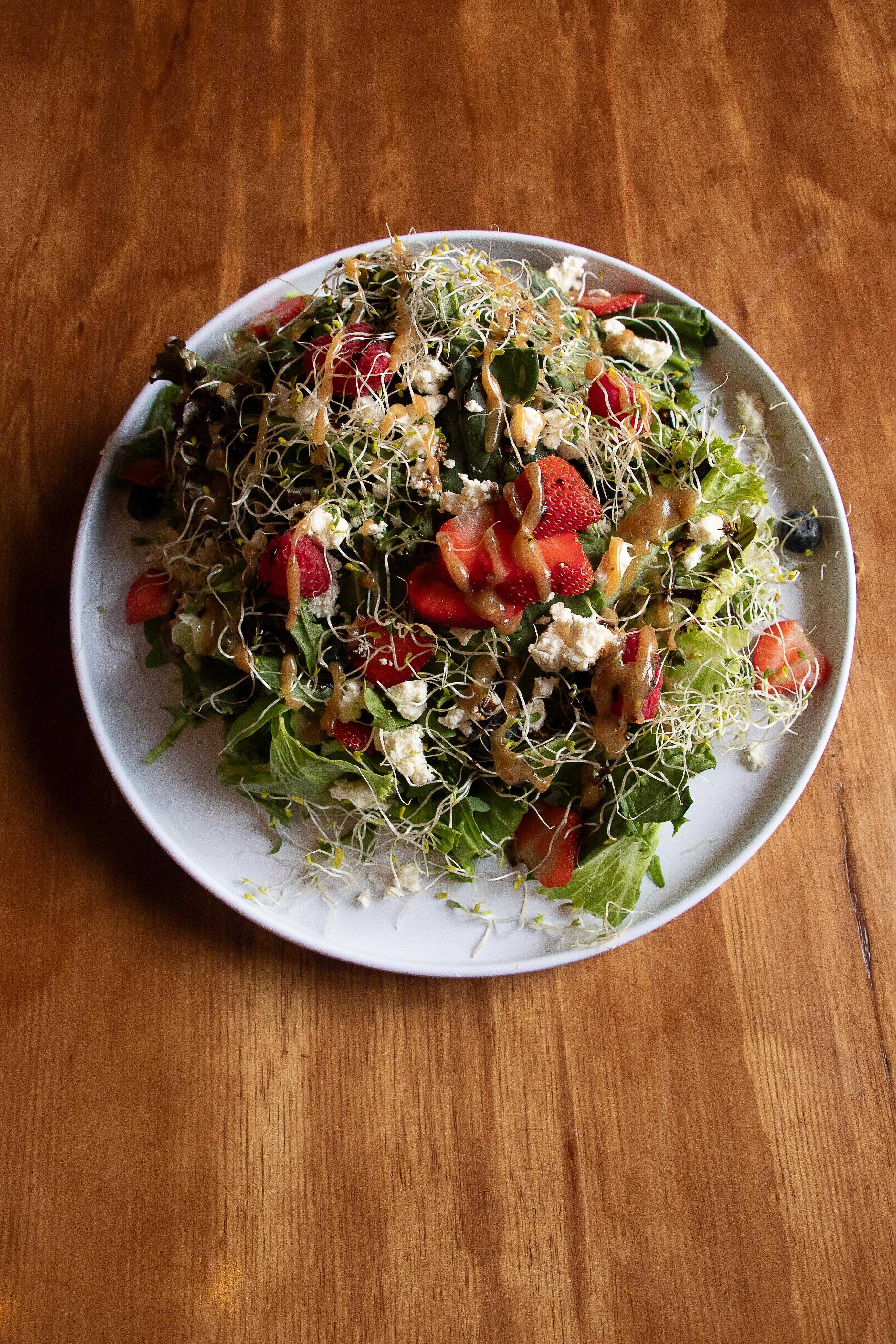 Mix de lechugas y espinaca con queso de cabra, germen de alfalfa y frutos rojos, acompañado de aderezo miel mostaza.