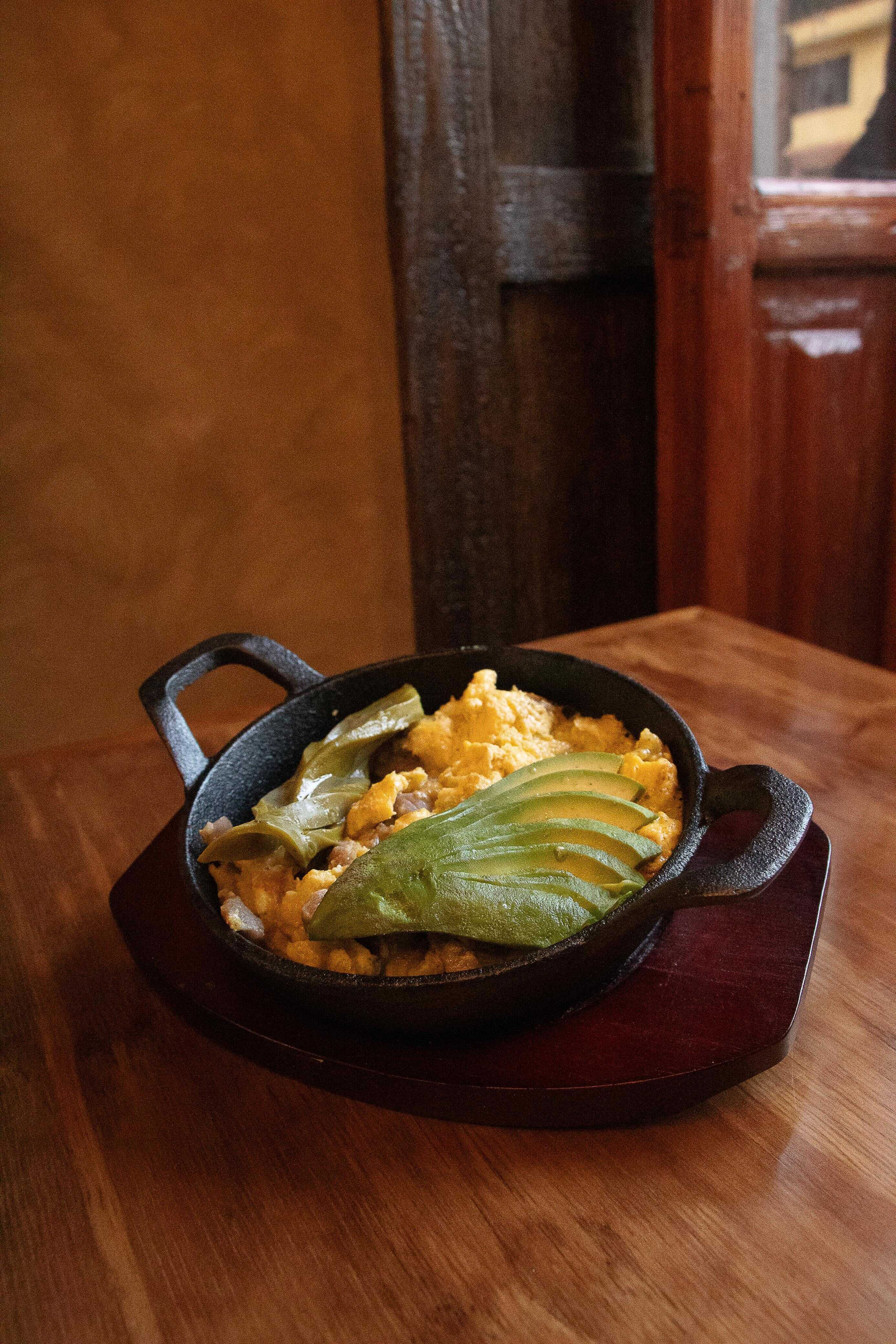 Huevos revueltos (3 piezas) en salsa verde, acompañados de cecina (100 g), guacamole y nopal asado.