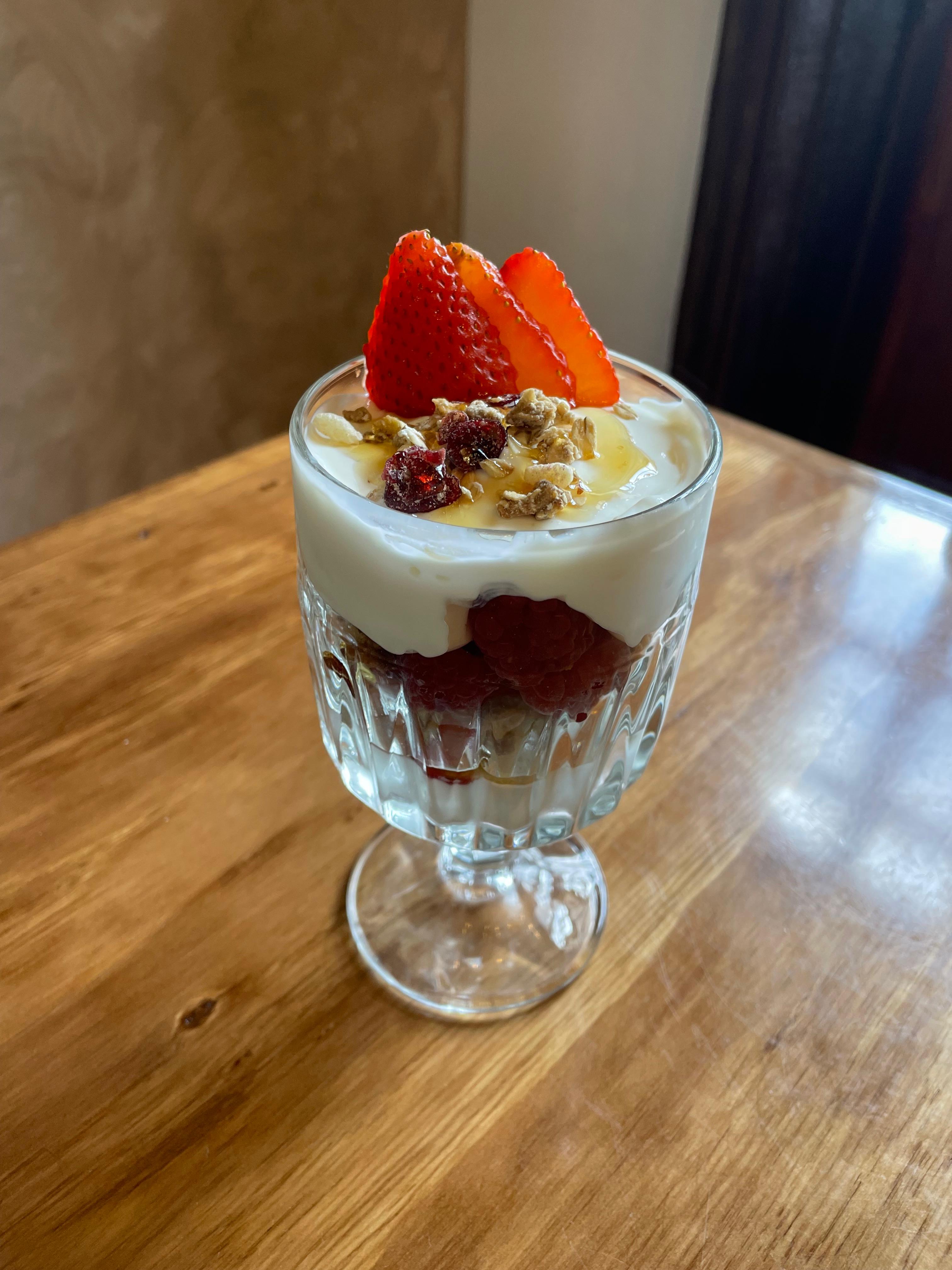Yogurt natural con fruta a elegir, acompañado de miel y granola.