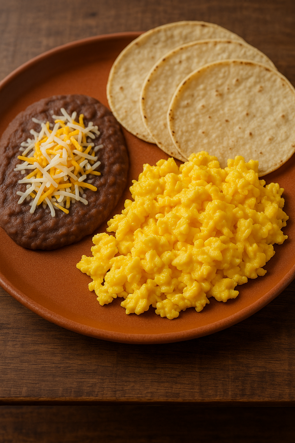Huevos al gusto, acompañados de frijoles refritos espolvoreados con mix de queso y 3 piezas de tortillas de maíz.