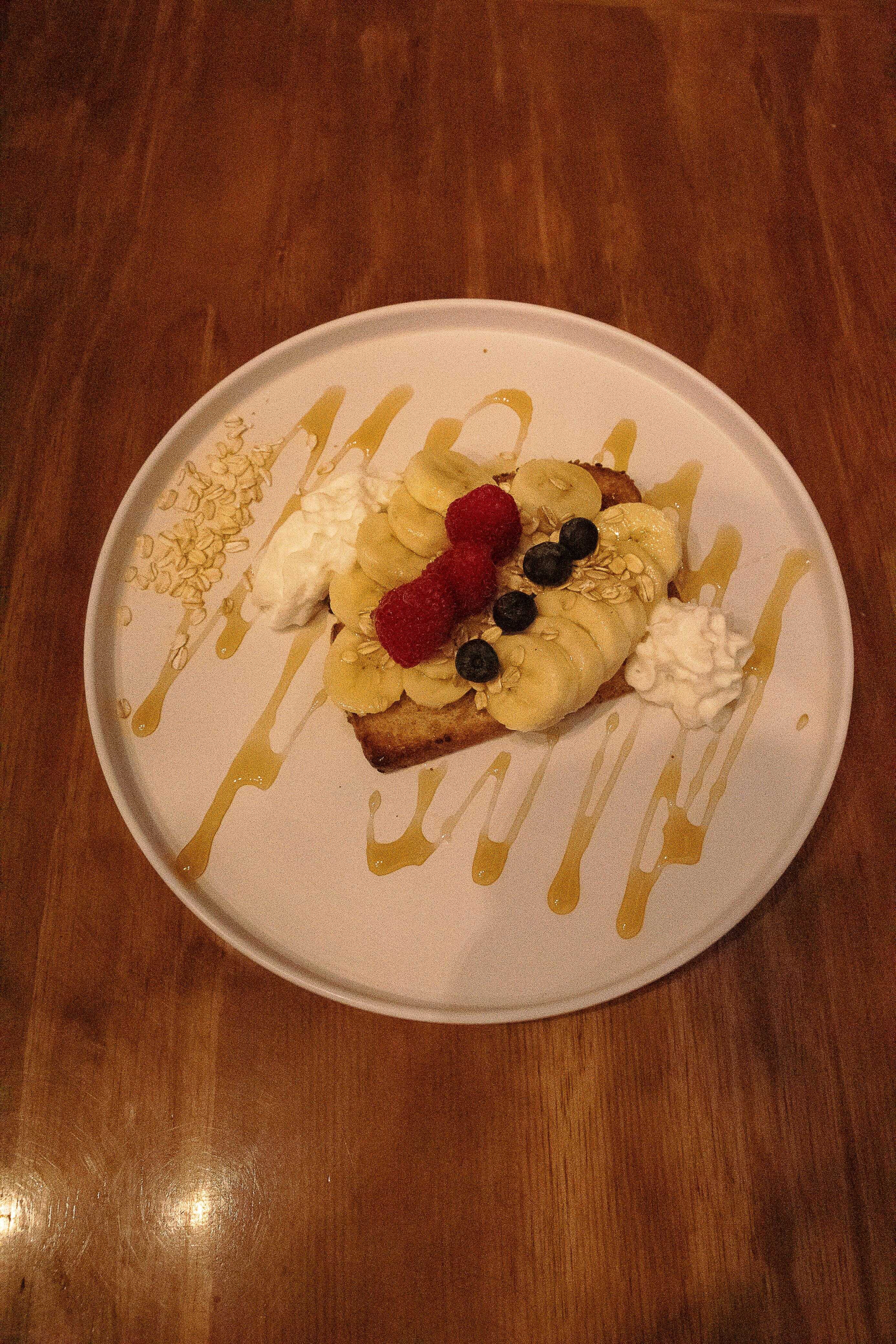1 pieza de pan 12 granos, tostado con plátano, miel, avena y berries.