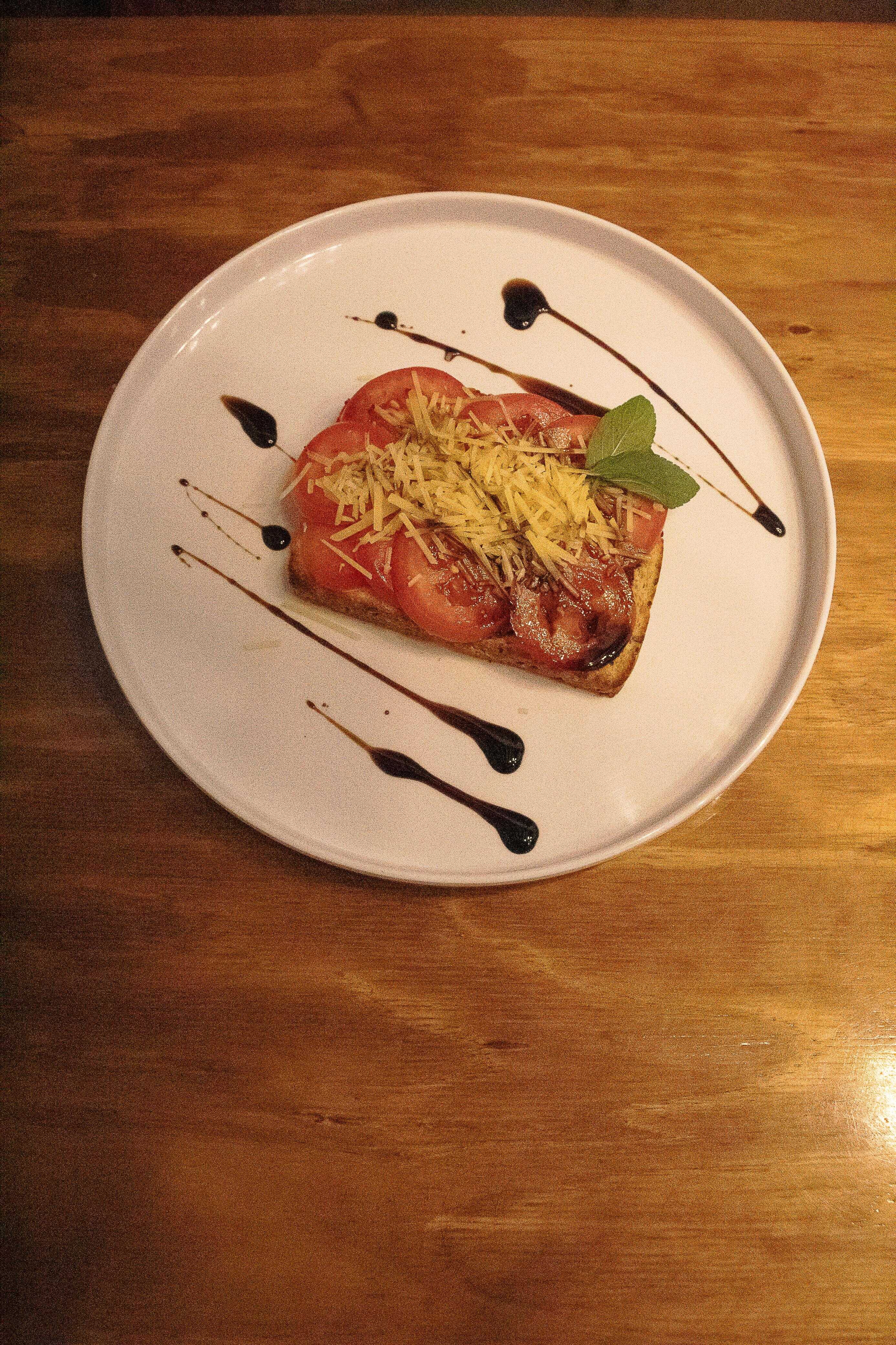 1 pieza de pan 12 granos, tostado con hojuelas de parmesano, rodajas de jitomate y reducción de balsámico.