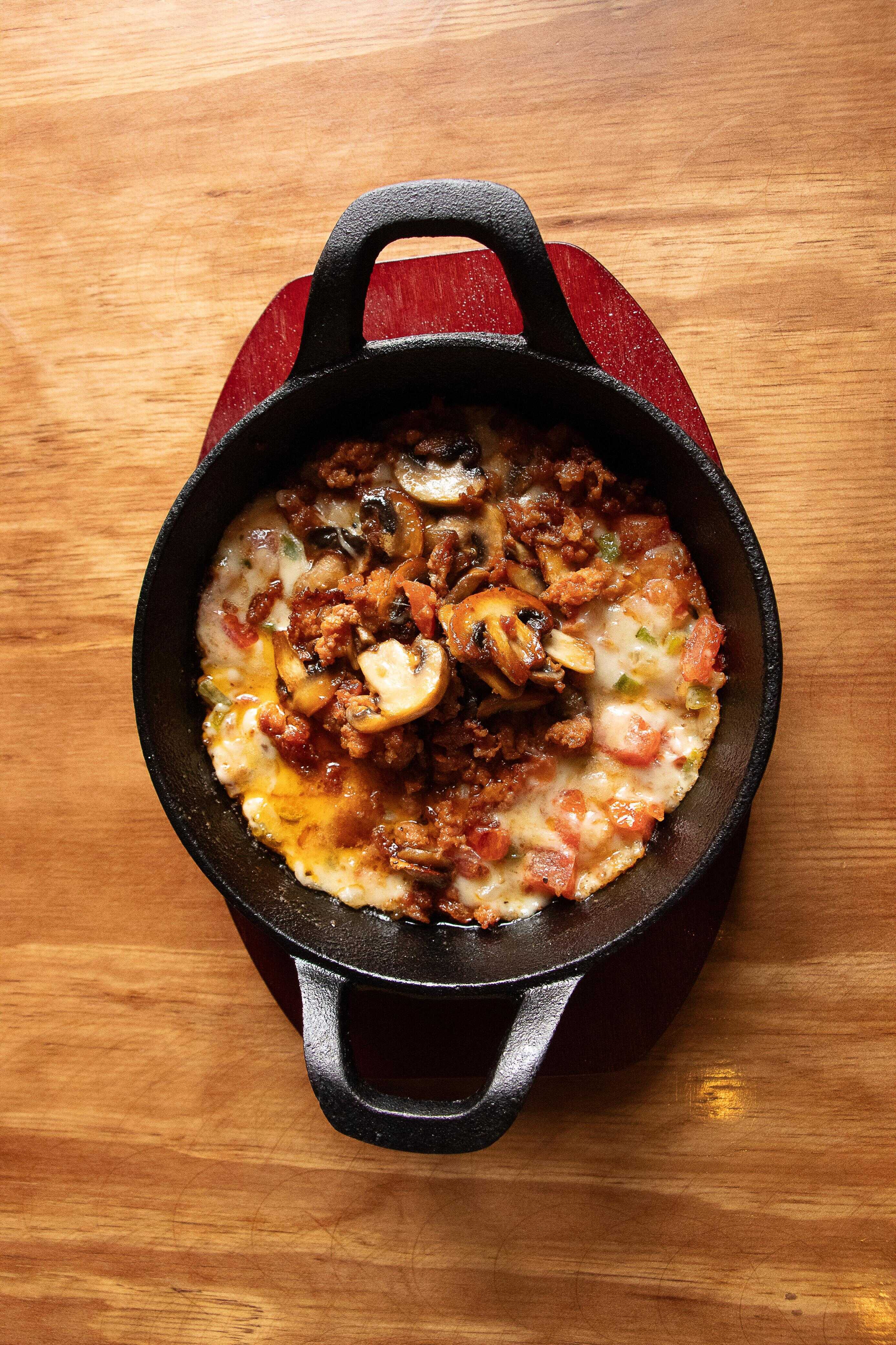 Queso manchego a la mexicana, acompañado de chorizo y champiñones, con tres tortillas de harina.