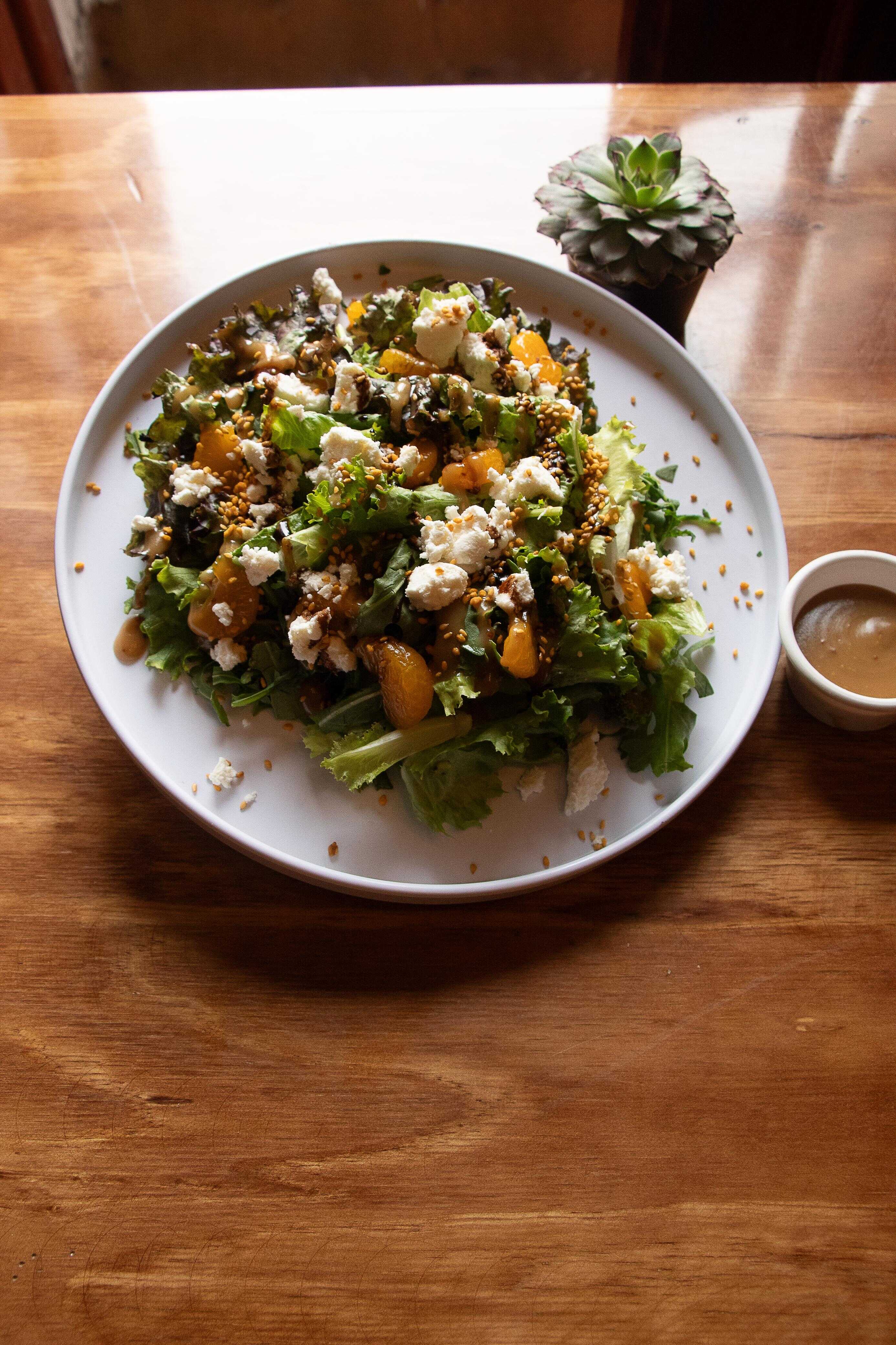 Mix de lechugas con supremas de mandarina, ajonjolí caramelizado y queso de cabra, acompañado de aderezo miel mostaza.
