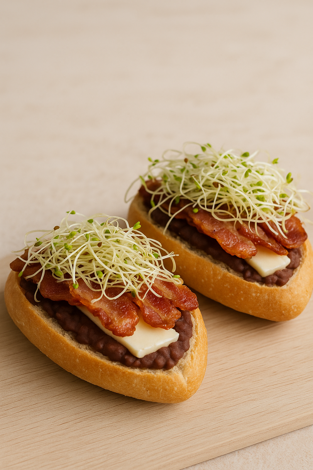 2 piezas de mini bolillo con frijoles, queso, germen de alfalfa y proteína a elegir.