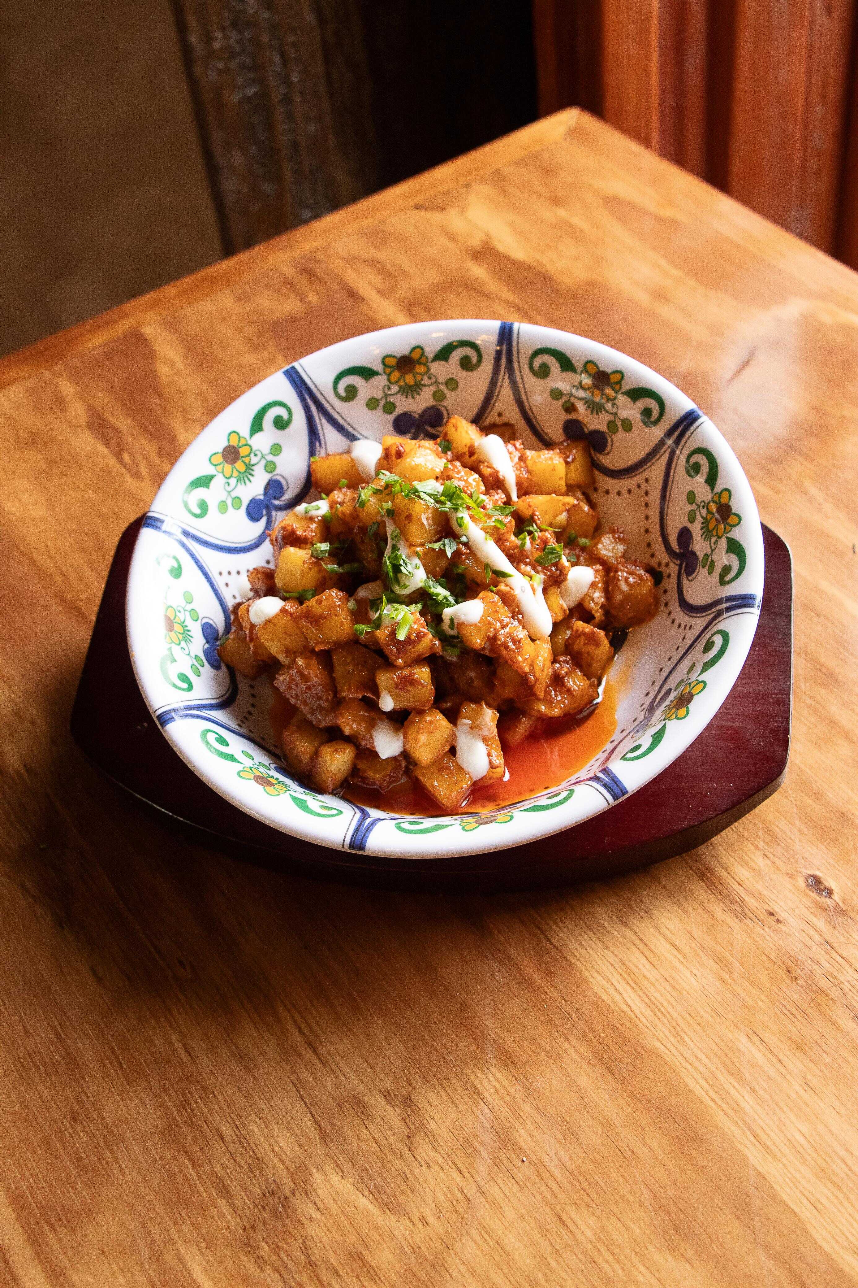Patatas confitadas, bañadas en salsa de la casa y alioli.