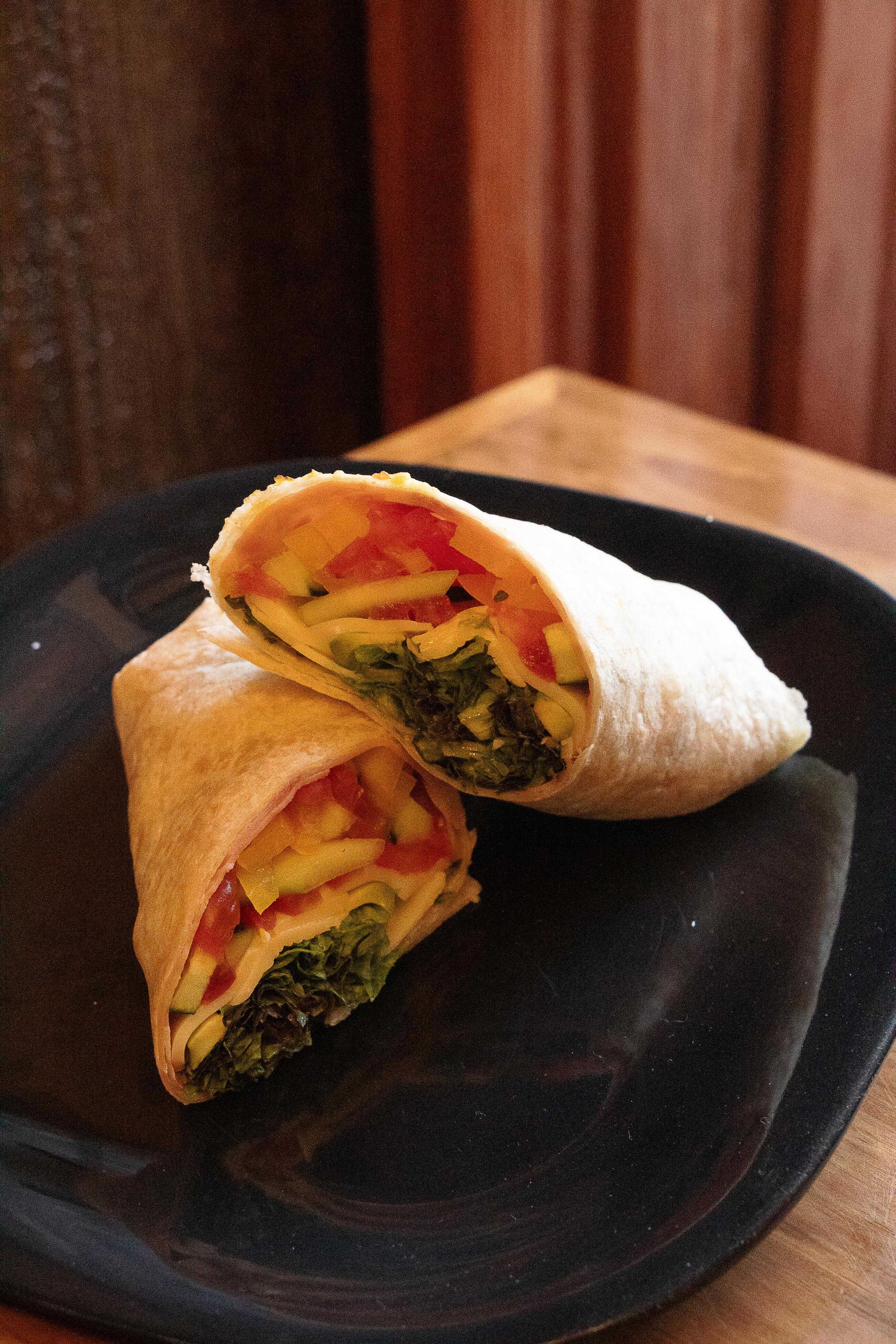 Burrito de jamón de pavo, queso manchego, lechuga, pepino, pimiento, jitomate y guacamole y acompañado de ensalada con jitomate cherry.