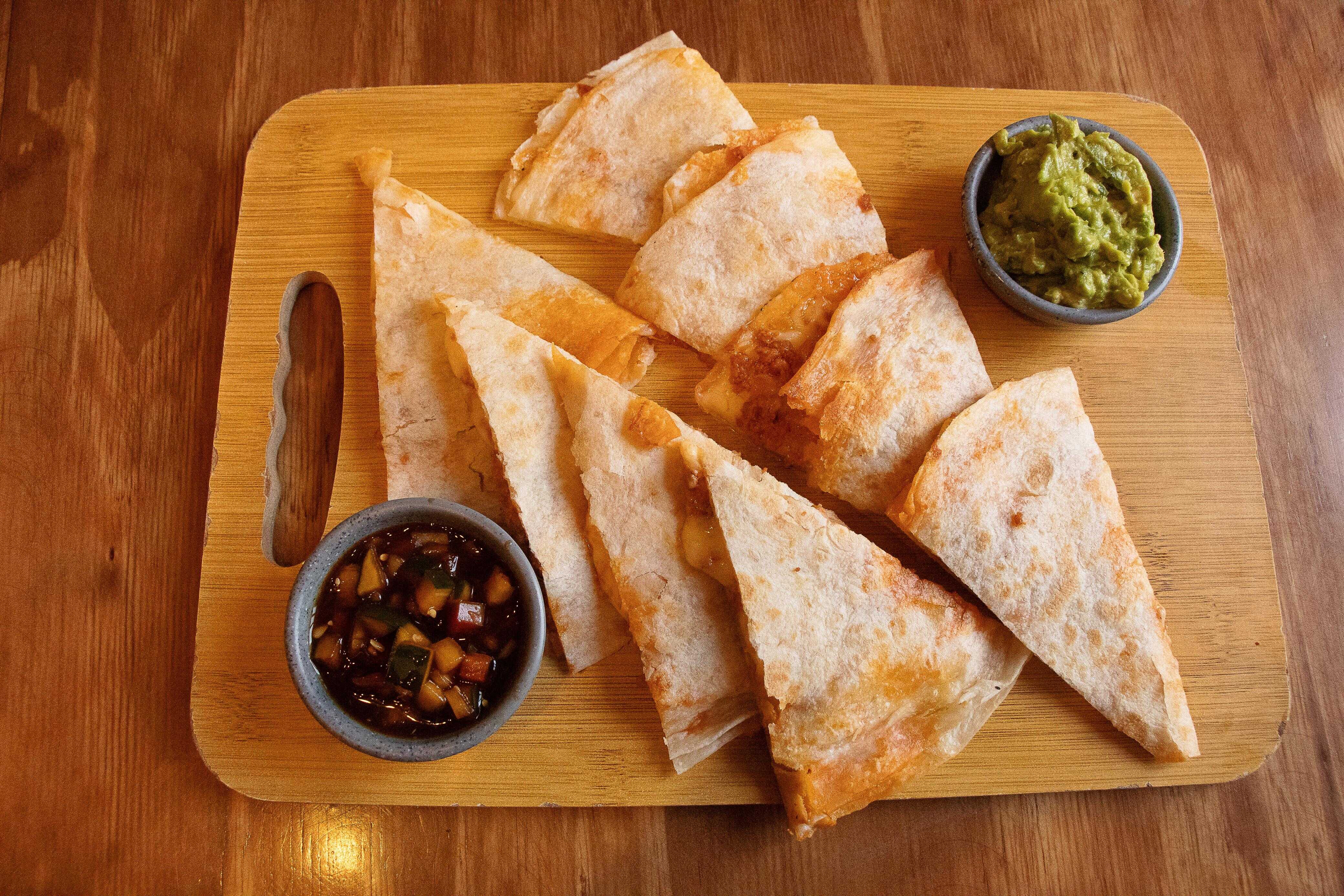 Tortillas de harina grandes, rellenas de choriqueso con mix de quesos, acompañadas de pico de gallo, frijoles y guacamole.