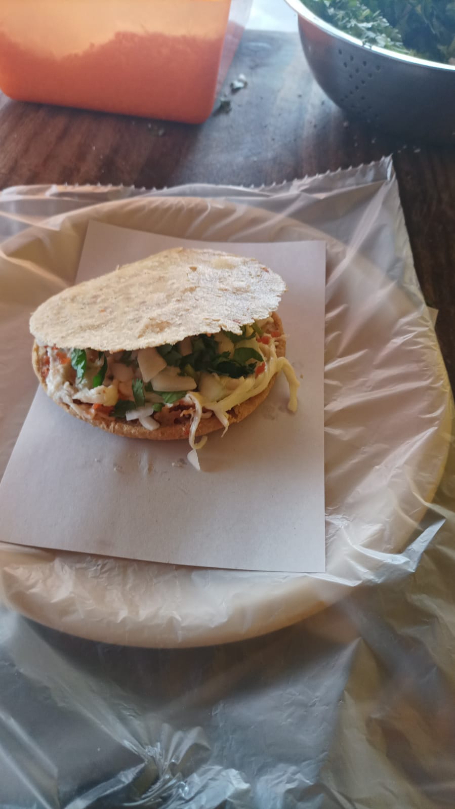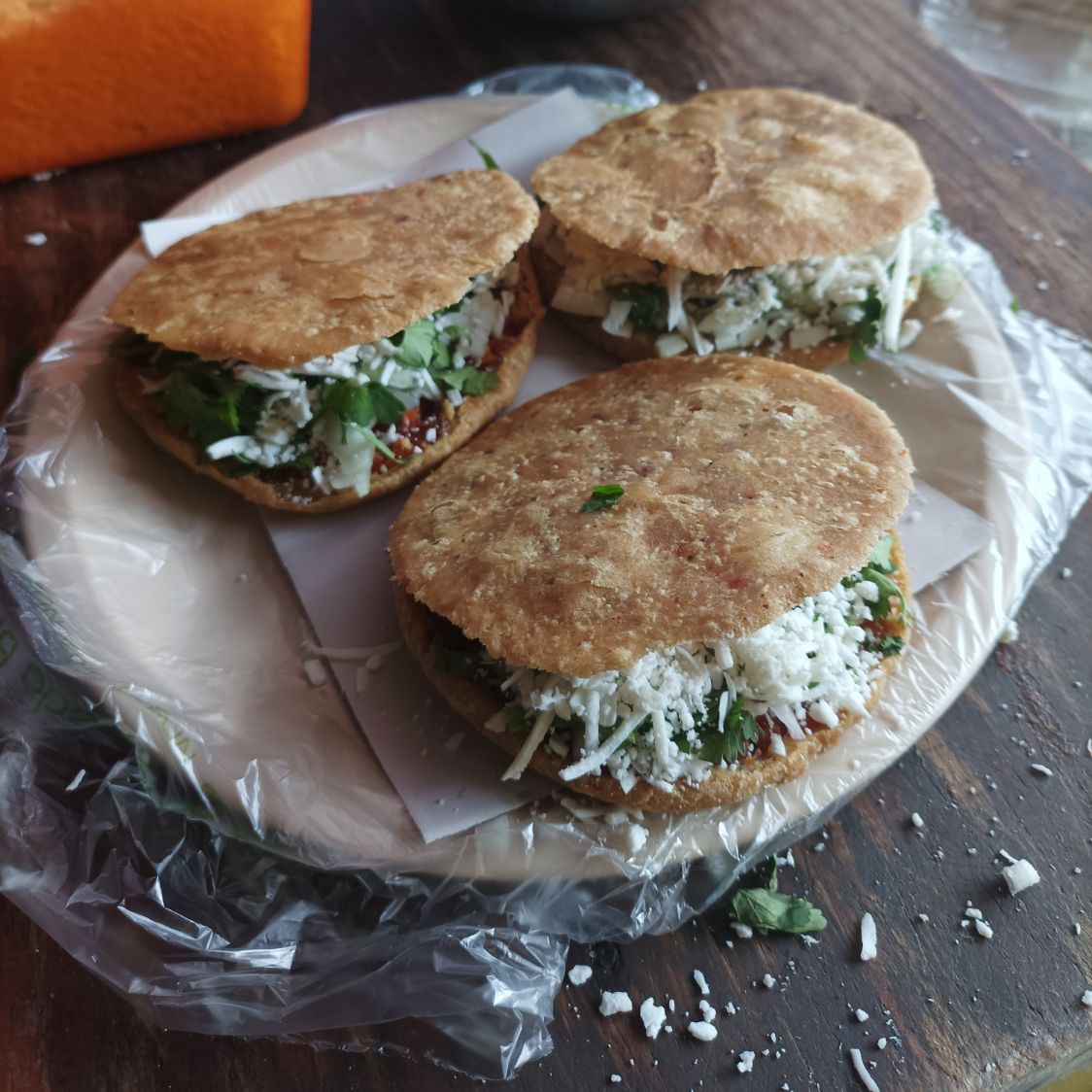 Gordita frita de 12 cm diametro preparada con cilantro, cebolla y queso rayado, salsas a parte.