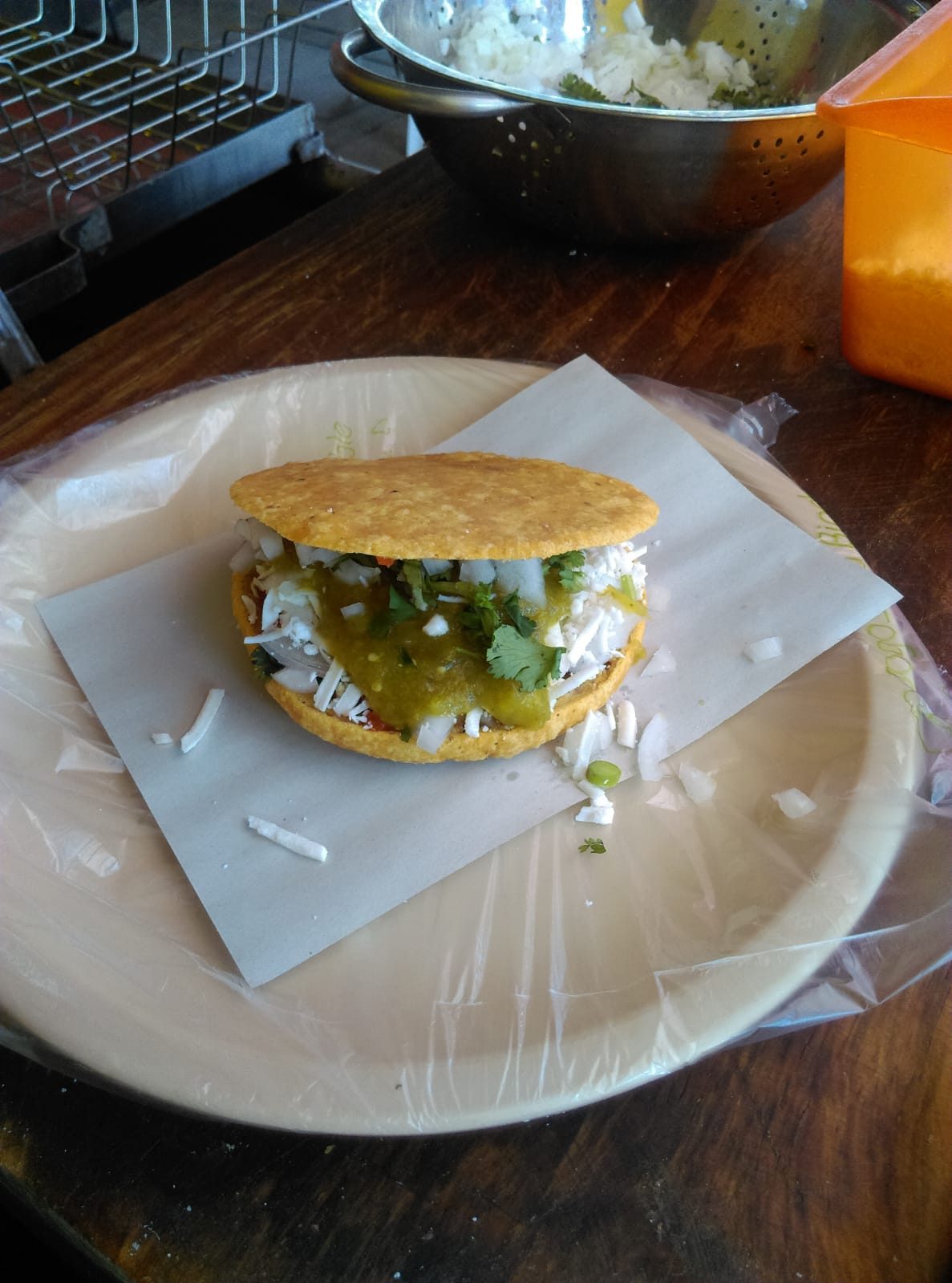 Gordita frita de 12 cm diametro con base de chicharron, pastor y queso. Preparada con cilantro, cebolla y queso rayado, salsas a parte.