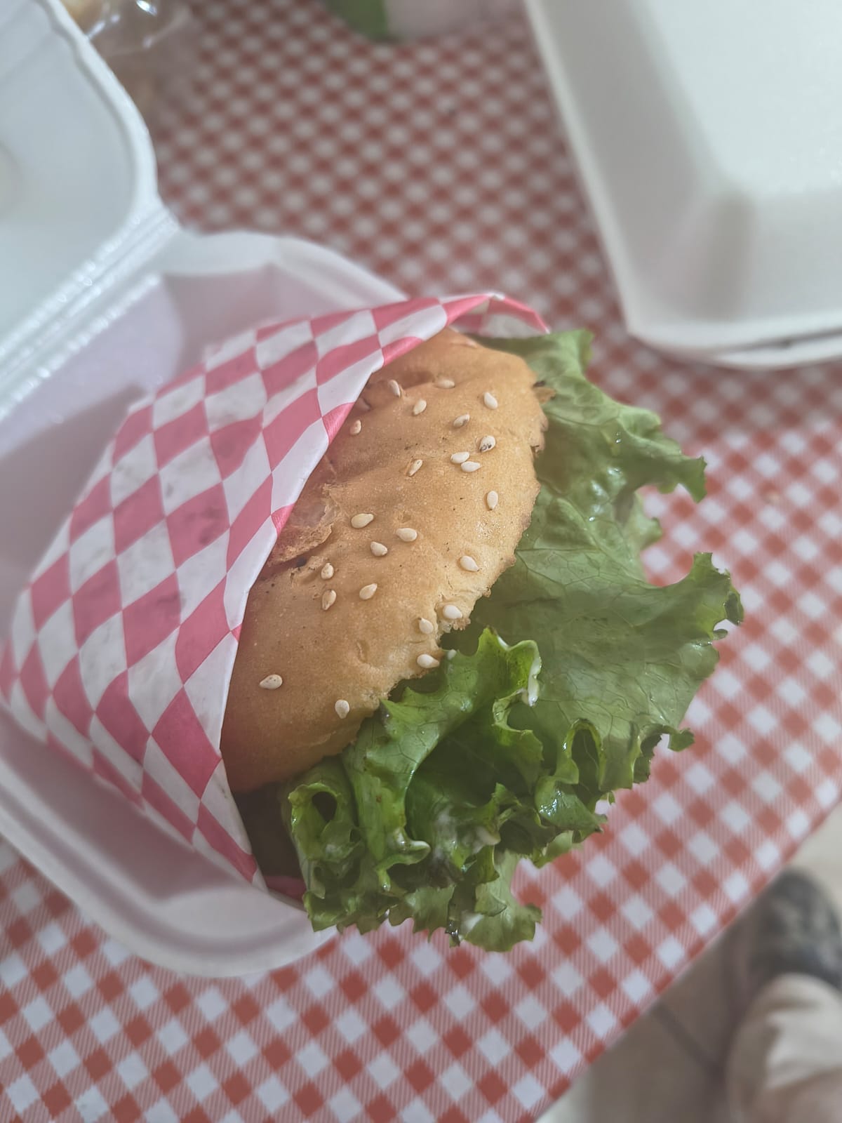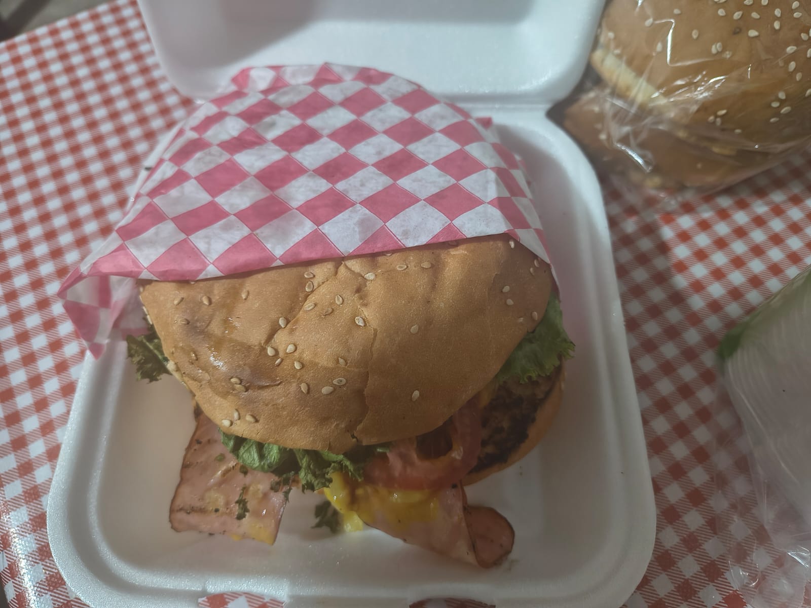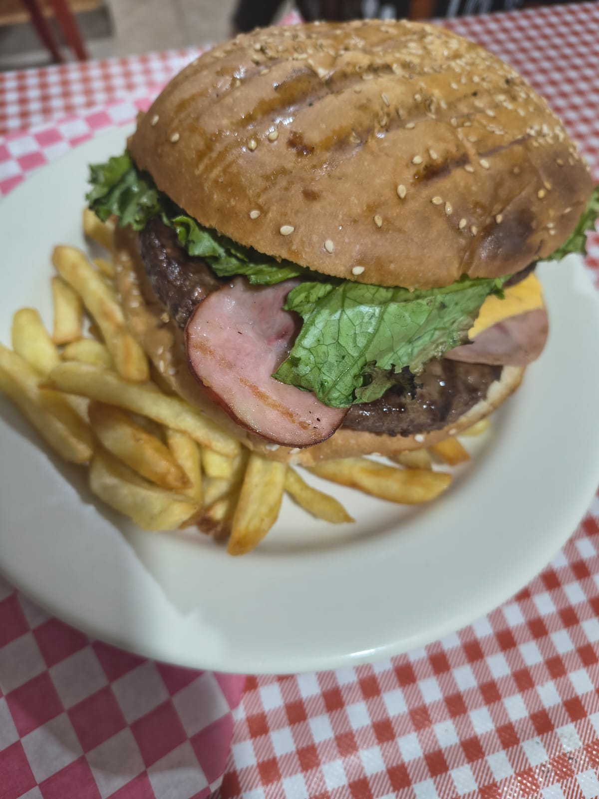 Carne de res (150 g), queso amarillo, lechuga, jitomate, pepinillos, cebolla y aderezos (cátsup, mayonesa y mostaza).