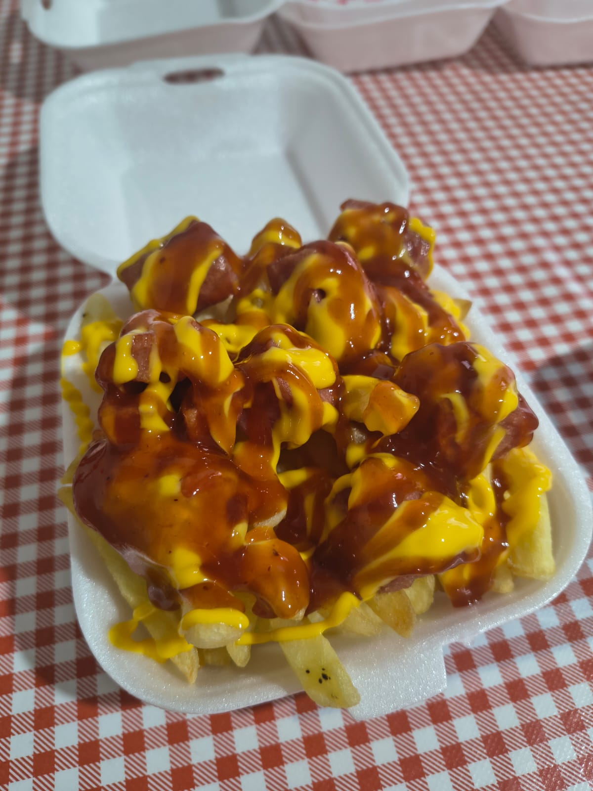 Pan jumbo, salchicha jumbo, tocino, queso, pina, jitomate, cebolla y aderezos (cátsup, mayonesa y mostaza).