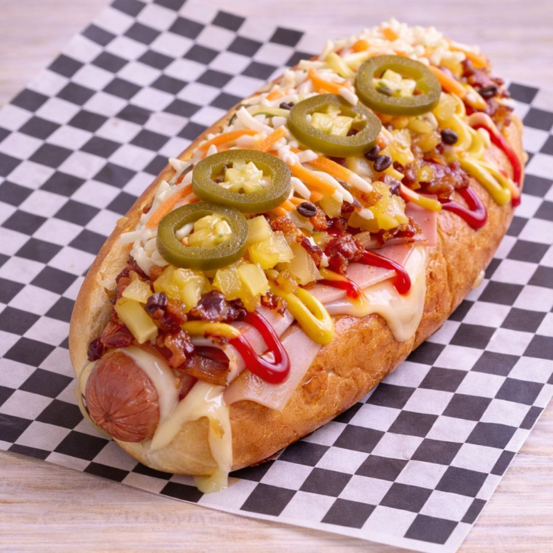 Pan casero, doble salchicha, ensalada de zanahoria, catpup, mostaza, mayonesa, tocino, jamon, queso manchego.
