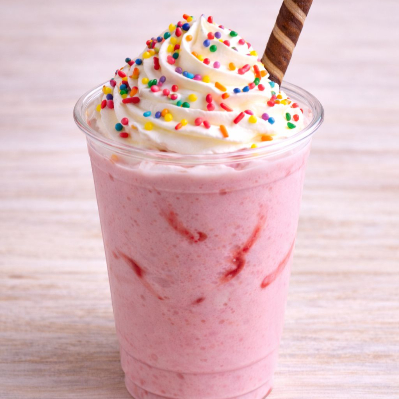 Malteada de fresa, con crema batida y palito de galleta