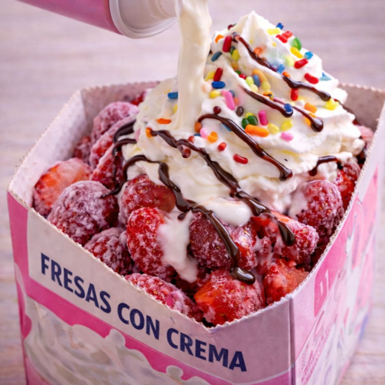 Fresas con crema, crema chantilly, chispas, chocolate liquido.