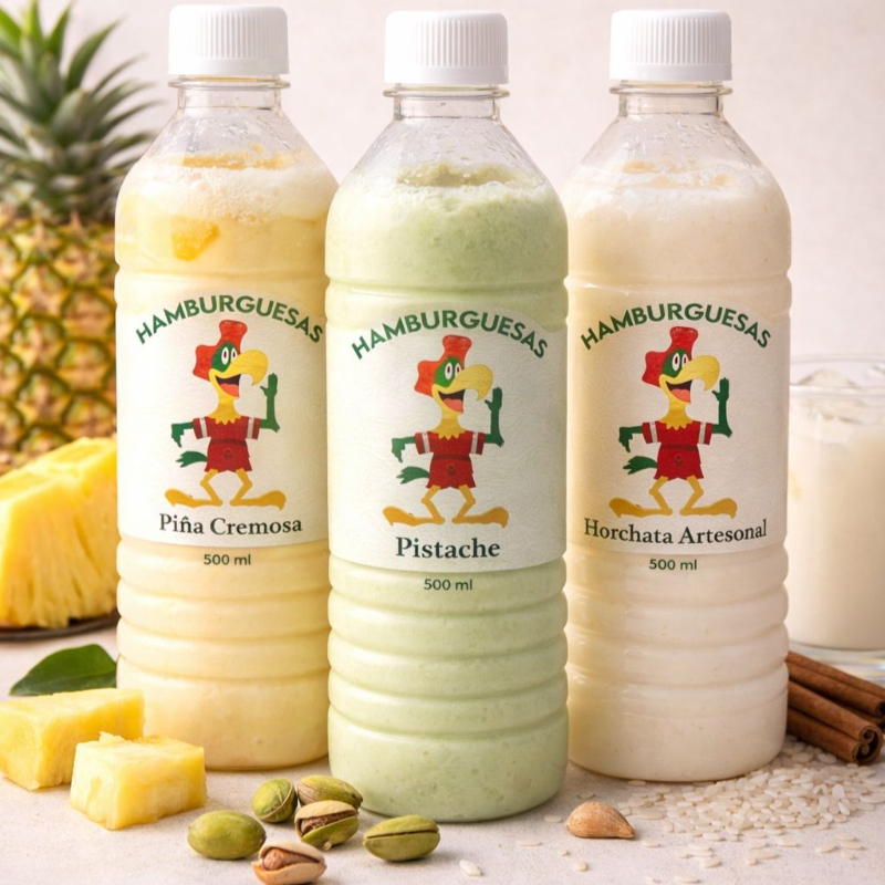 Pan casero, carne casera, queso manchego, queso amarillo, tocino, mayonesa, catsup, mostaza, lechuga y chistorra. Picante se pone aparte (Chiles caseros)