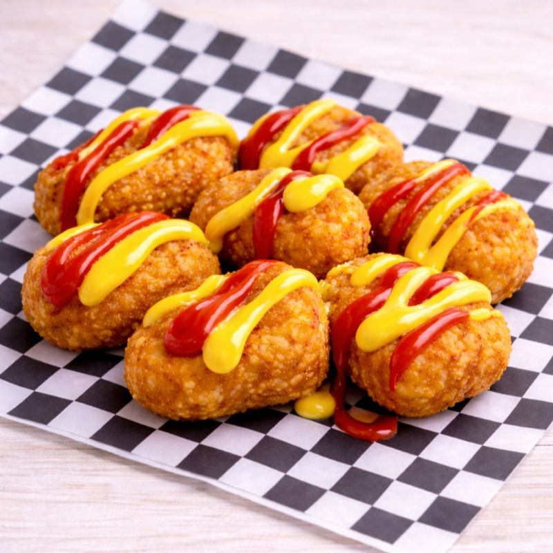 Con catsup, mostaza y queso para nachos.