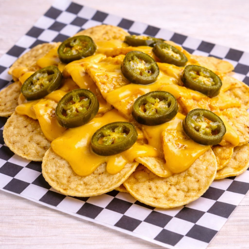 Nachos, queso y chiles en vinagre caseros.