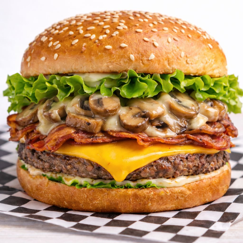 Pan casero, carne casera, mayonesa, mostaza, catpsup, queso amarillo, queso manchego, champiñones. Picante se pone aparte (chiles caseros)