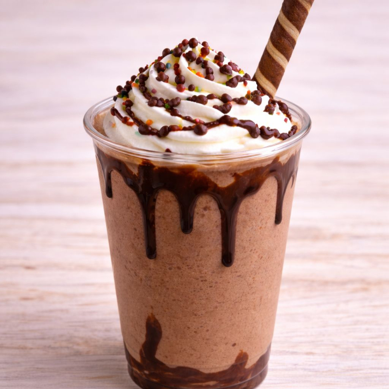 Malteada de chocolate, crema batida, palito de galleta