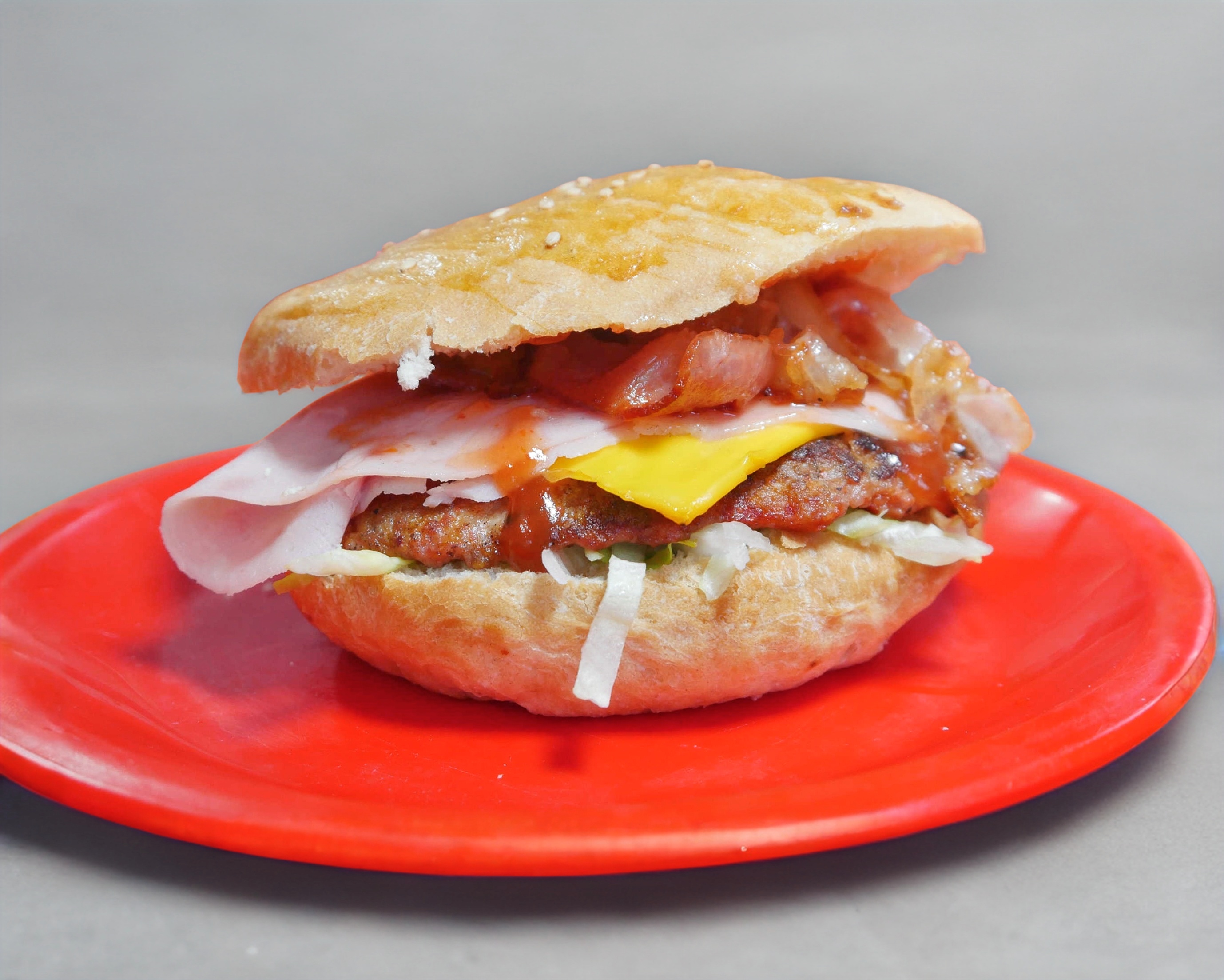 Carne, queso amarillo, jamón y tocino.