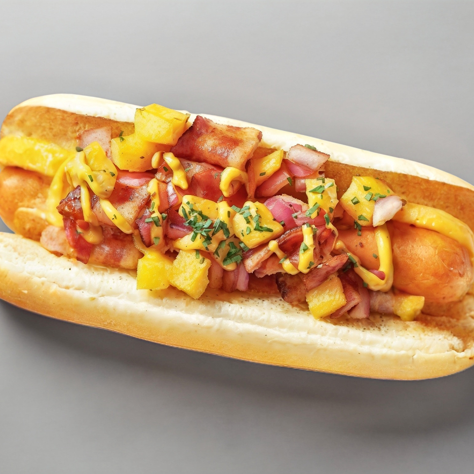Deliciosa salchicha frita con mantequilla, jamón , queso oaxaca, queso tipo americano, tocino y piña asada, cebolla asada o natural, jitomate, aderezos chiles en vinagre.