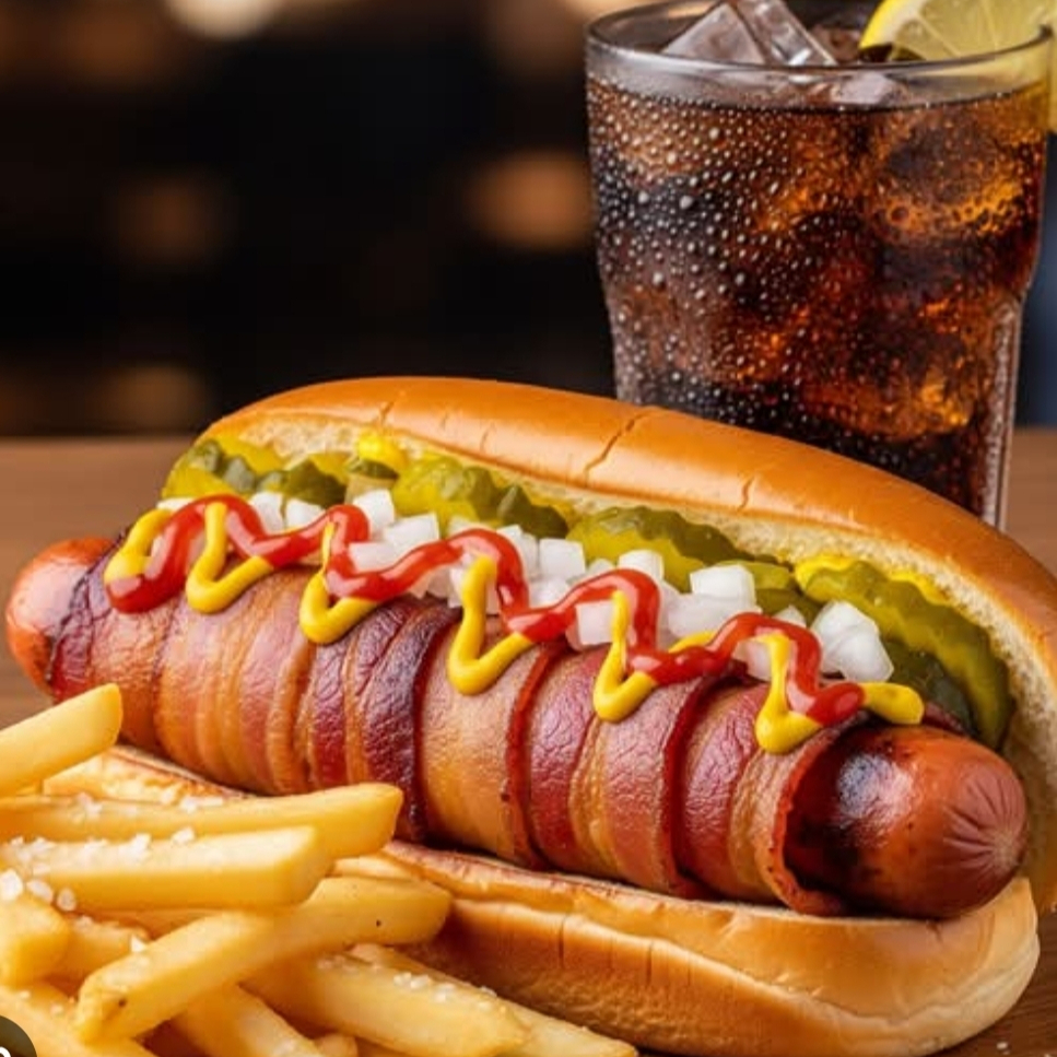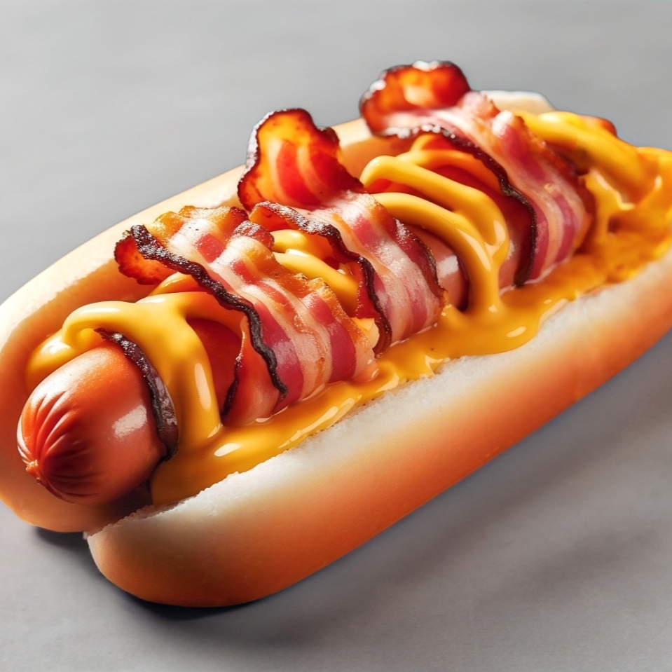 Hot dog con salchicha frita en mantequilla, jamón queso amarillo, queso oaxaca, tocino,jitomate, cebolla, chiles, aderezos.