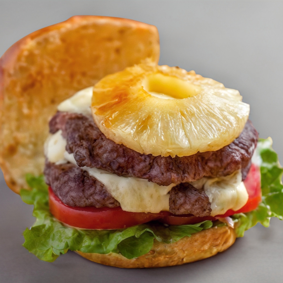 Hamburguesa con carne 80/20 res y cerdo,Piña en almibar asada, salchicha, jamón, tocino, queso amarillo, queso oaxaca, lechuga, jitomate, cebolla, chiles aderezos.