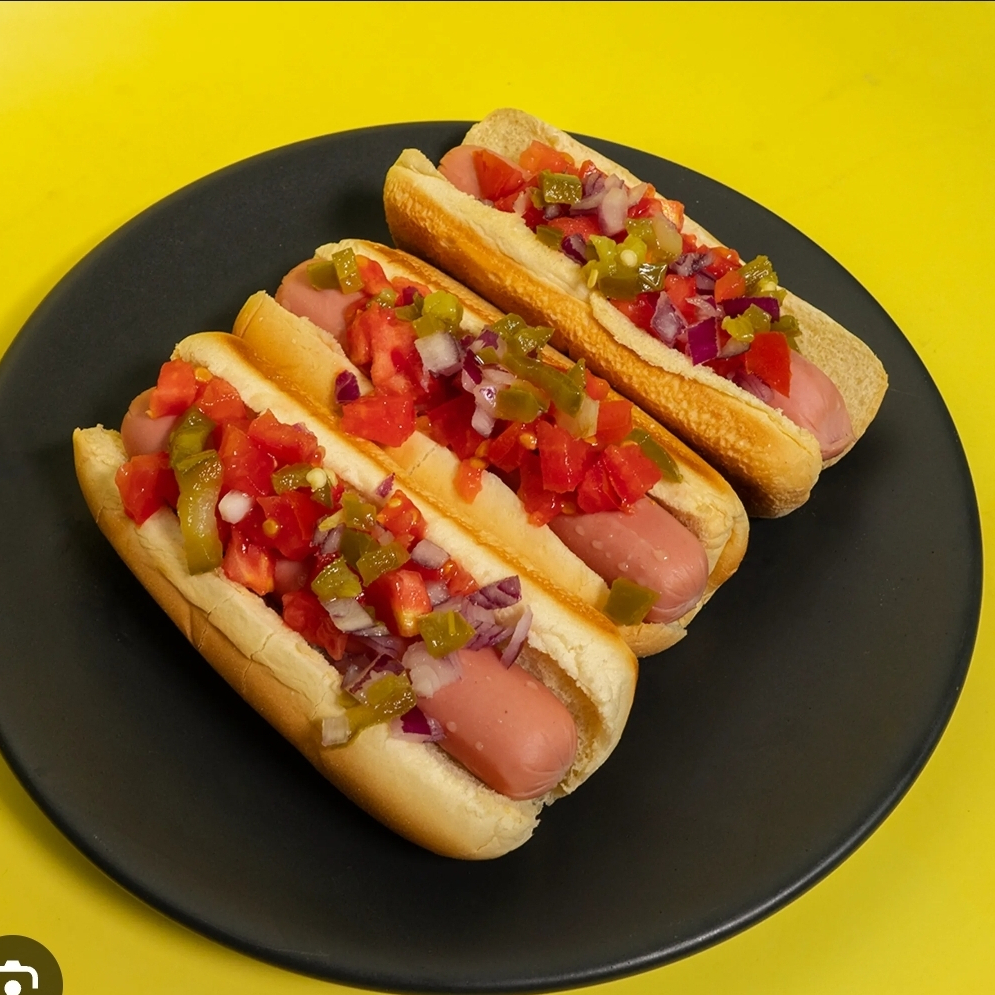 Orden de 3 hot dogs sencillos , salchicha frita con mantequilla, jitomate, cebolla, chiles en vinagre y aderezos( mayonesa, mostaza, catsup).