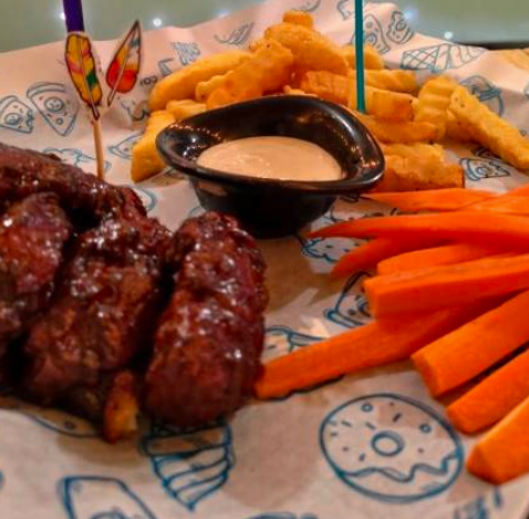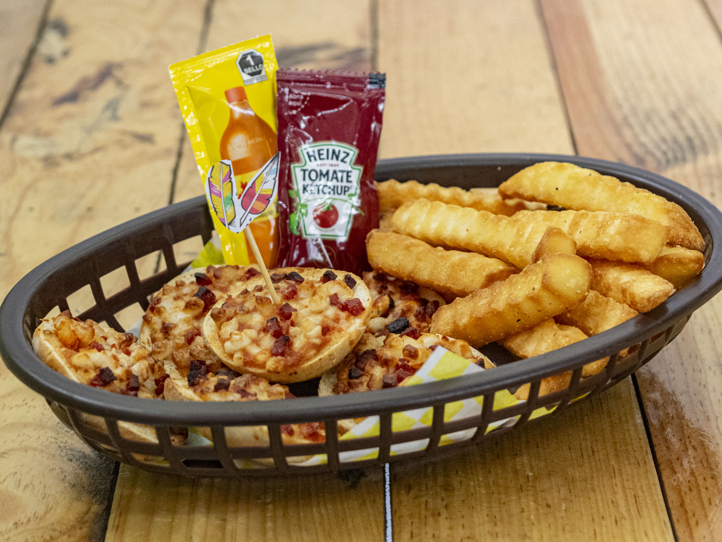 Acompañado de papas a la francesa, bastones de zanahoria y apio y delicioso aderezo ranch.