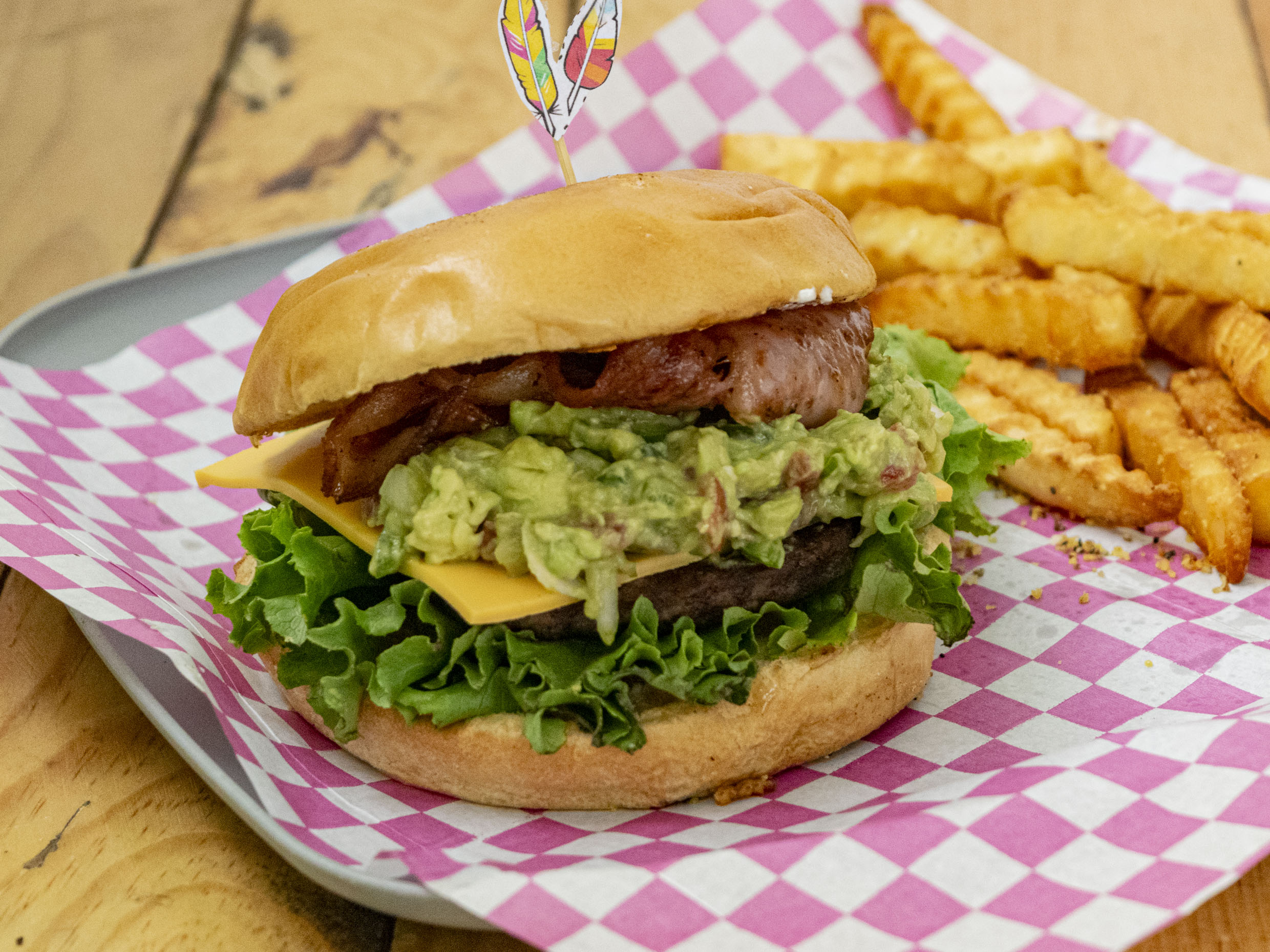 Deliciosa carne de res o pollo, con guacamole, tocino, queso amarillo, lechuga, jitomate y cebolla. En pan brioche. Acompañada con papas a la francesa.