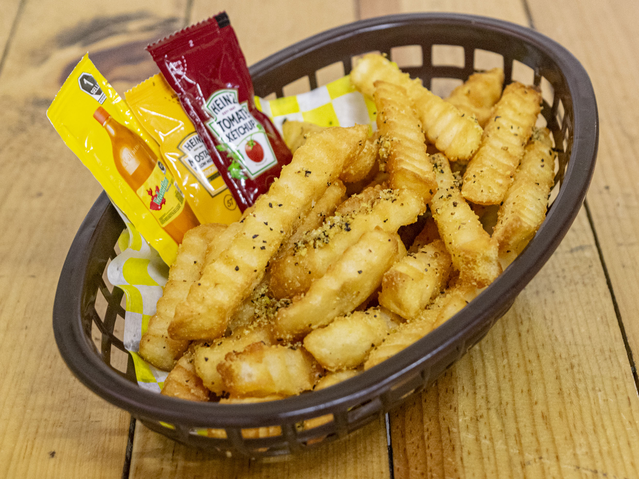 Órdenes: mediana (170 g) o grande (370 g); deliciosas papas onduladas con condimento de pimienta-limón.