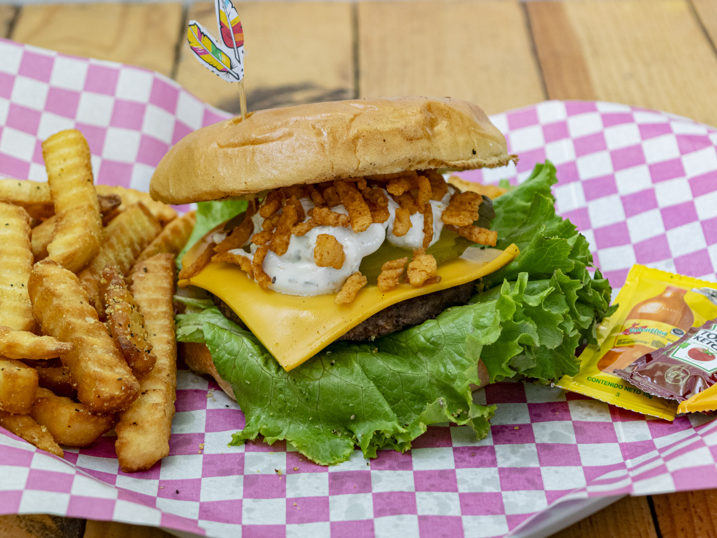 Hamburguesa Aderezo Blanco y Cebollas Crispy