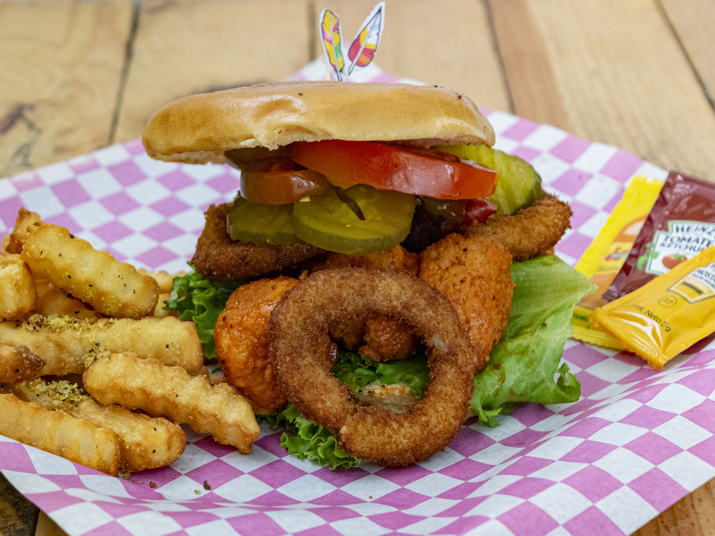Hamburguesa de boneless bañados en la salsa de tu eleccion, con aros de cebolla y aderezo de chipotle. Acompañado de papas a la francesa