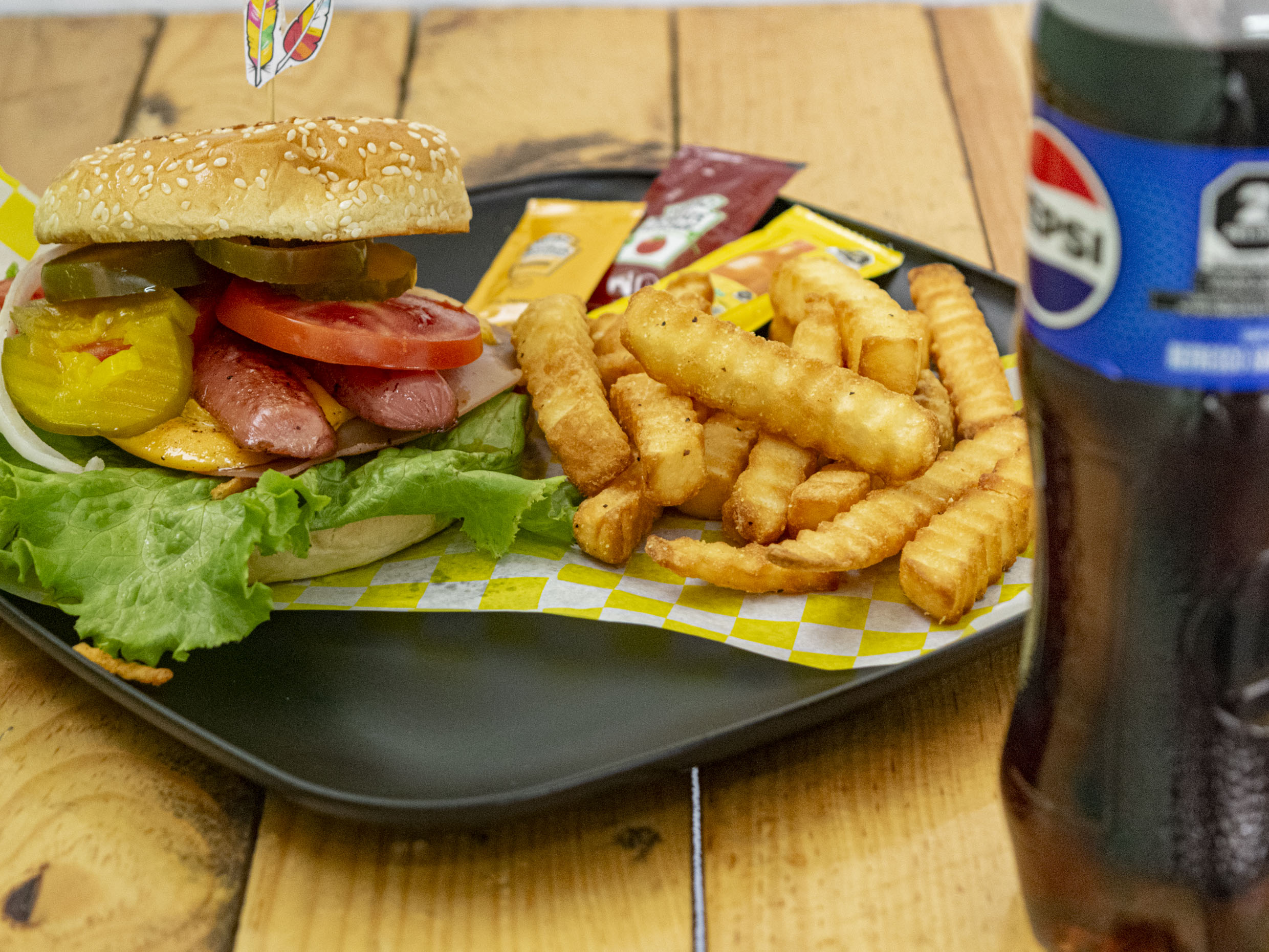 Jugosa carne de res o pollo haciendo juego con el aderezo especial de la casa, cebollitas crispí y queso amarillo, todo junto crea una delicia de hamburguesa, lechuga, jitomate y cebolla. Acompañada con papas a la francesa.