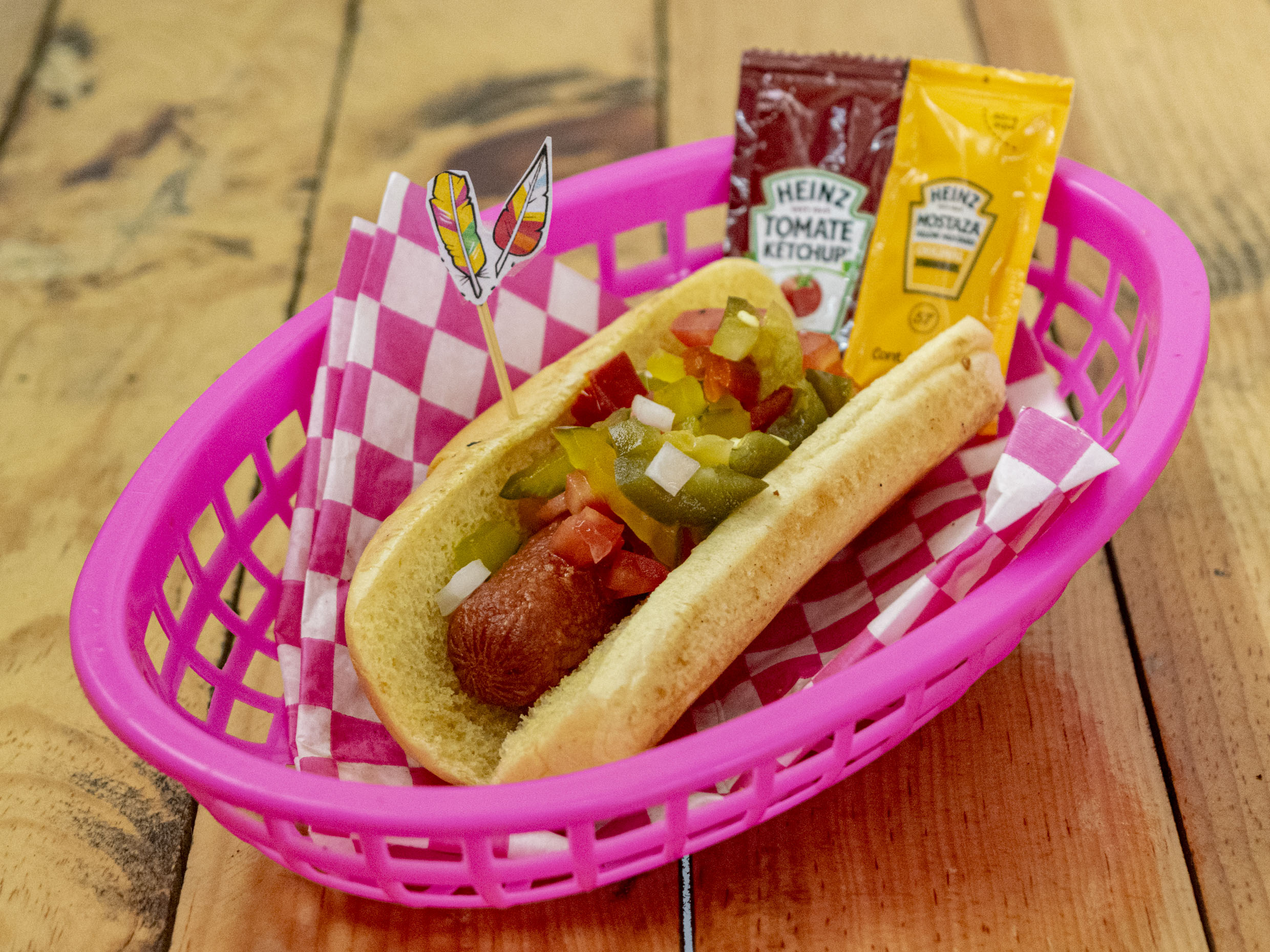 El único hot dog gigante, acompañado de tocino, con papas a la francesa.