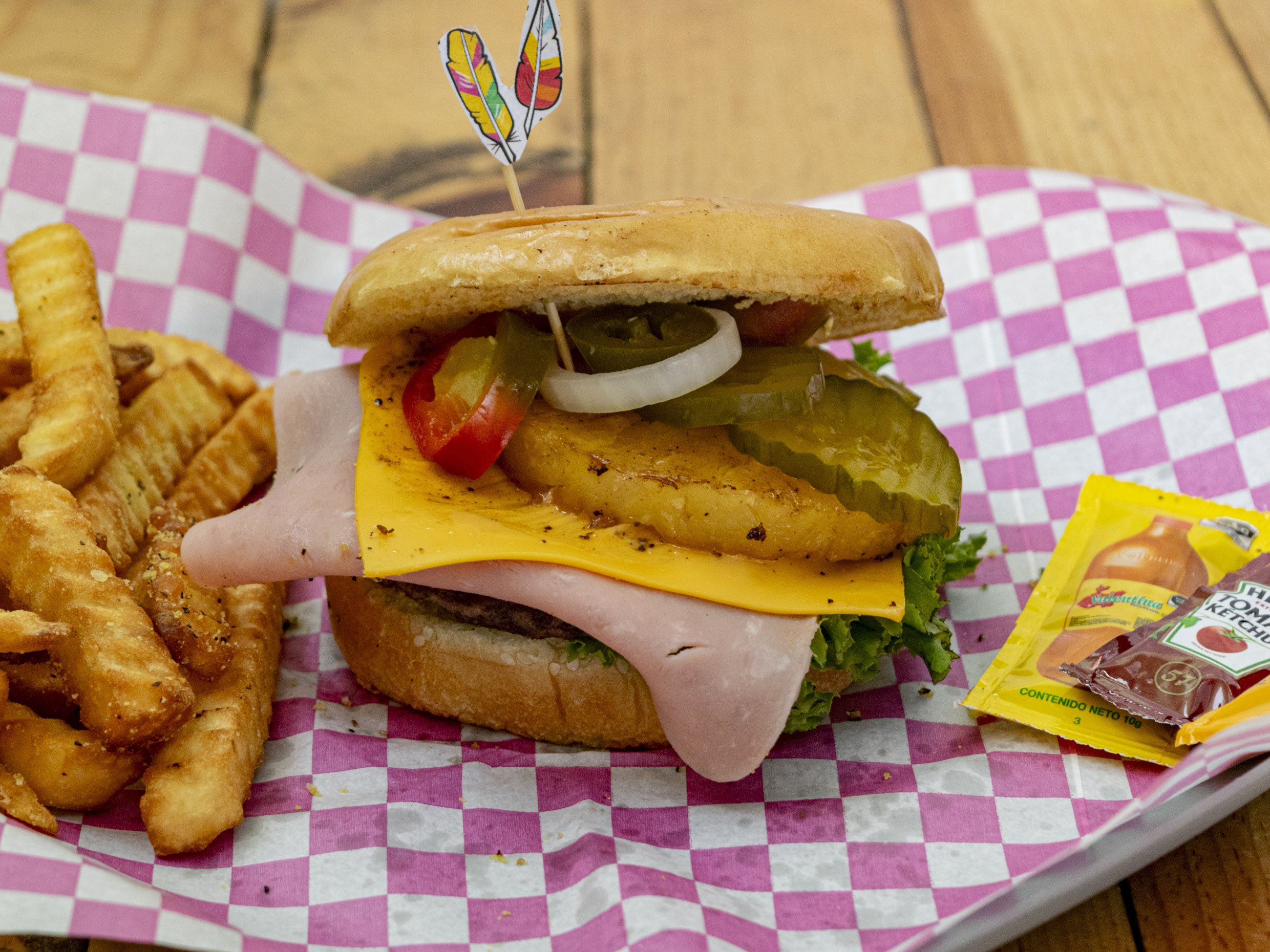 Tradicional hamburguesa hawaiana pero más sabrosa. Carne de res, piña, jamón, queso amarillo, lechuga, jitomate y cebolla. Acompañada con papas a la francesa.