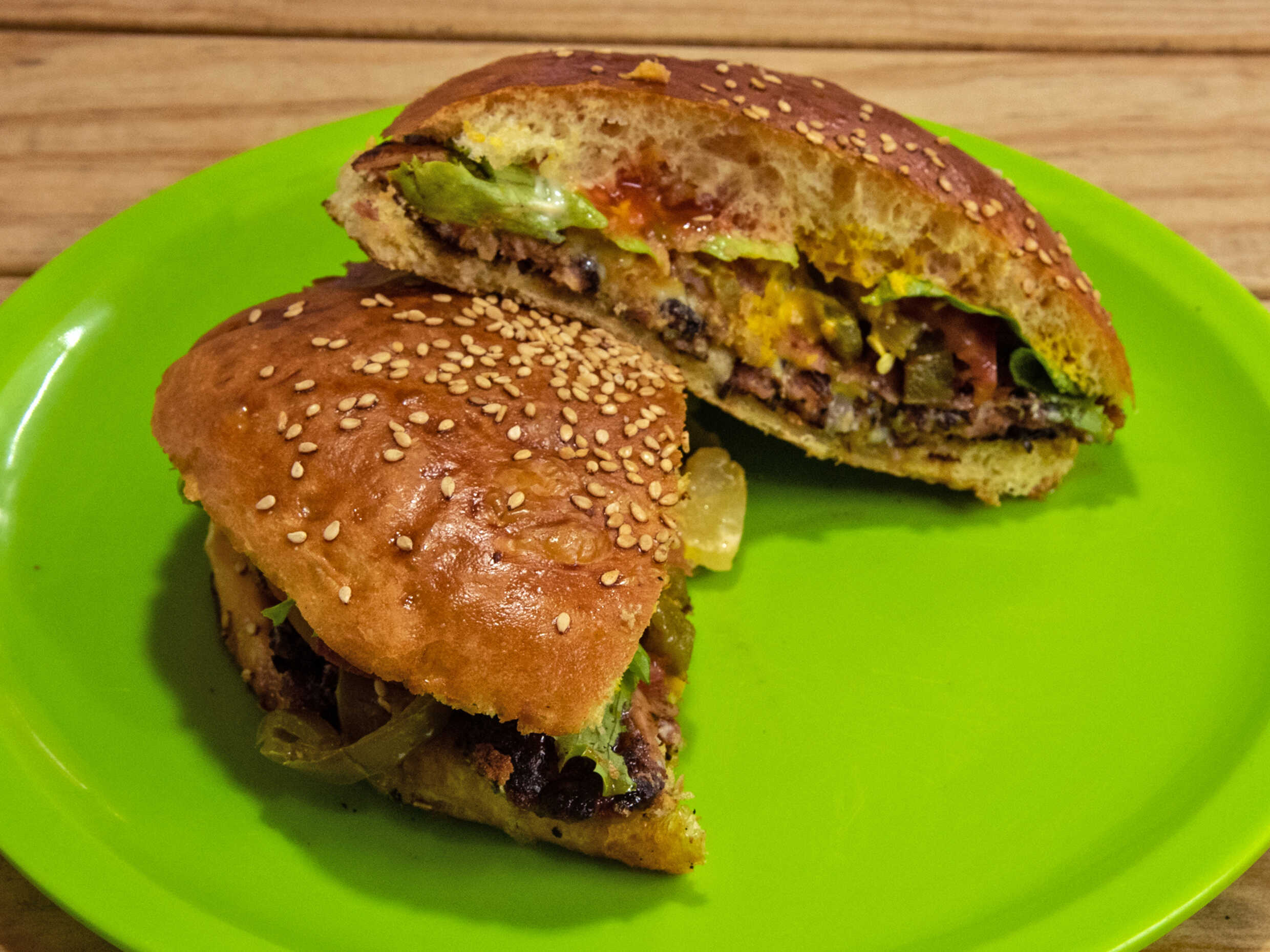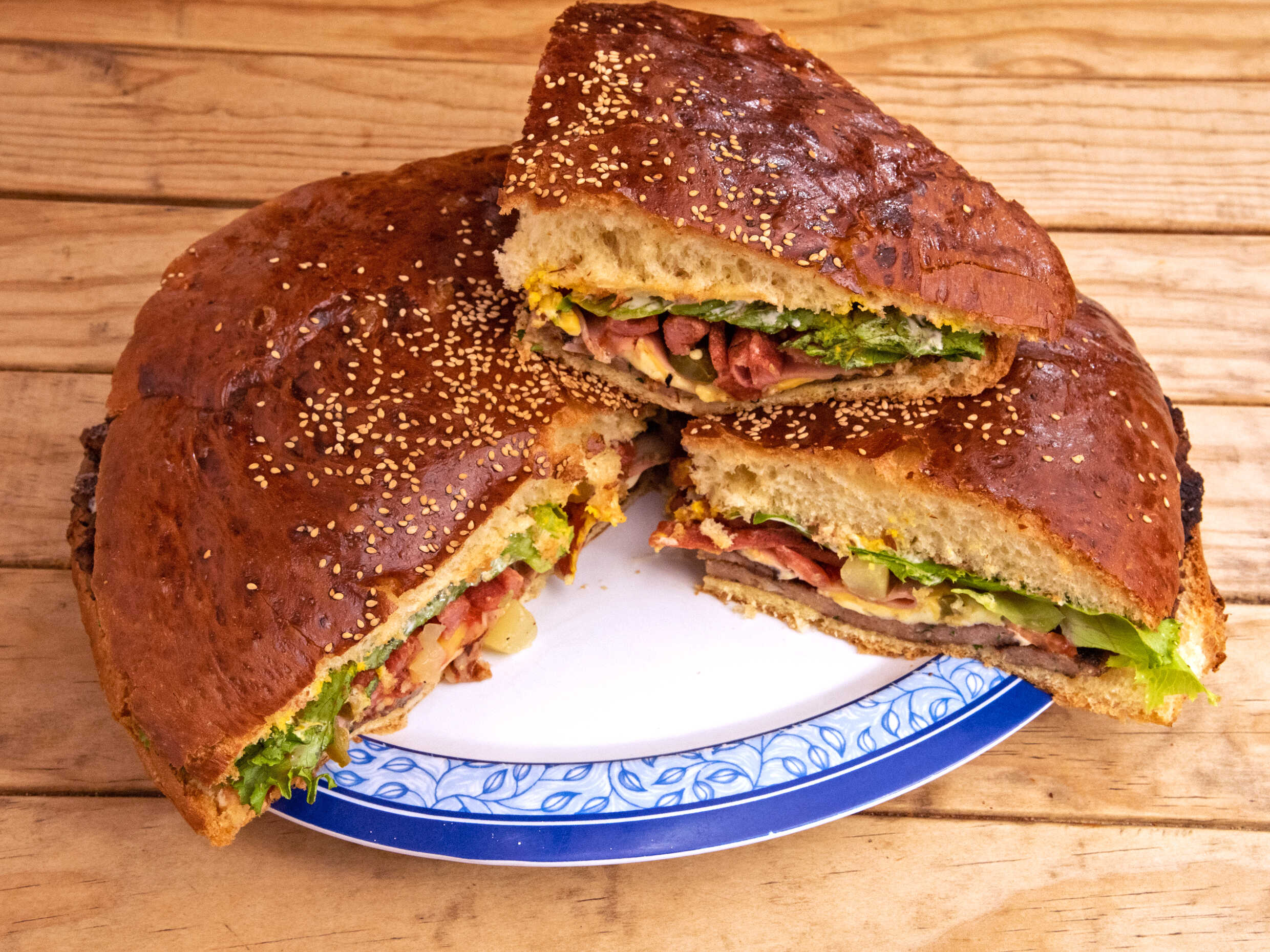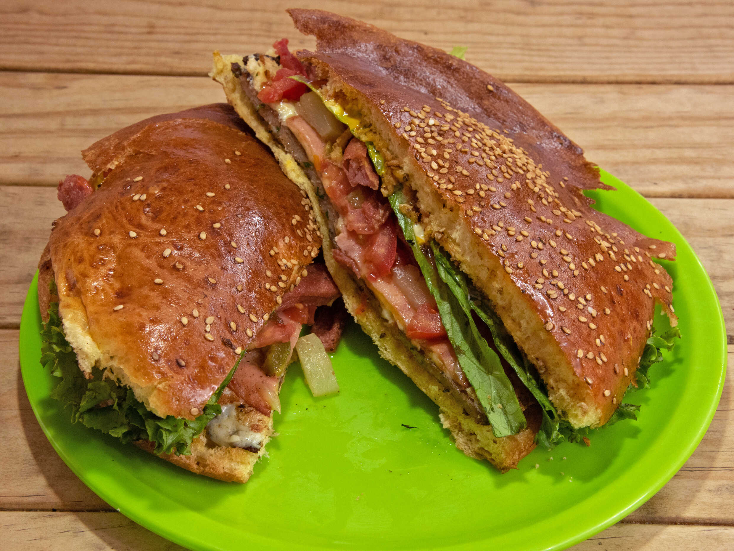 Lleva queso amarillo, queso oaxaca, jitomate, chiles, lechuga, cátsup, mayonesa y mostaza.