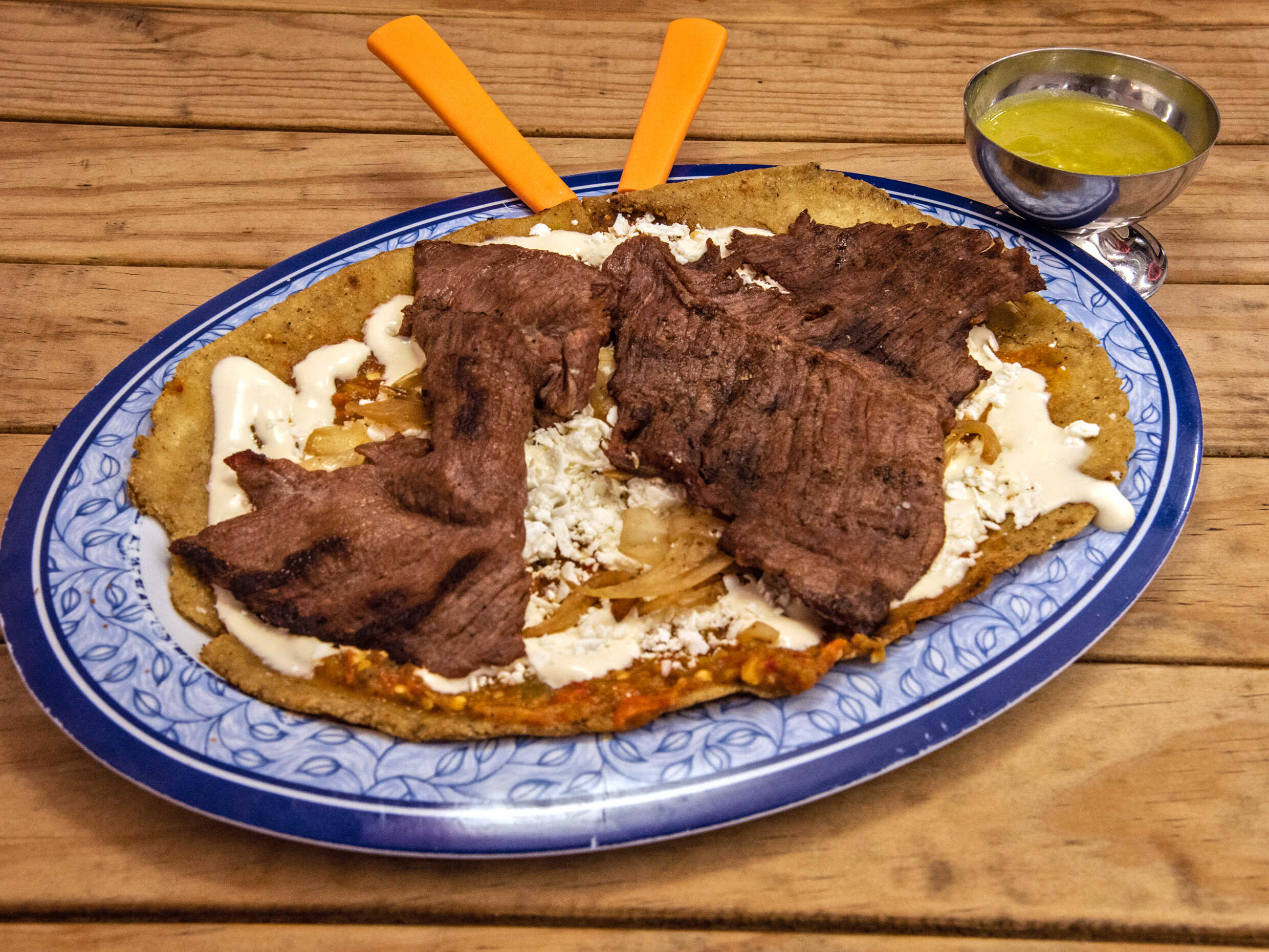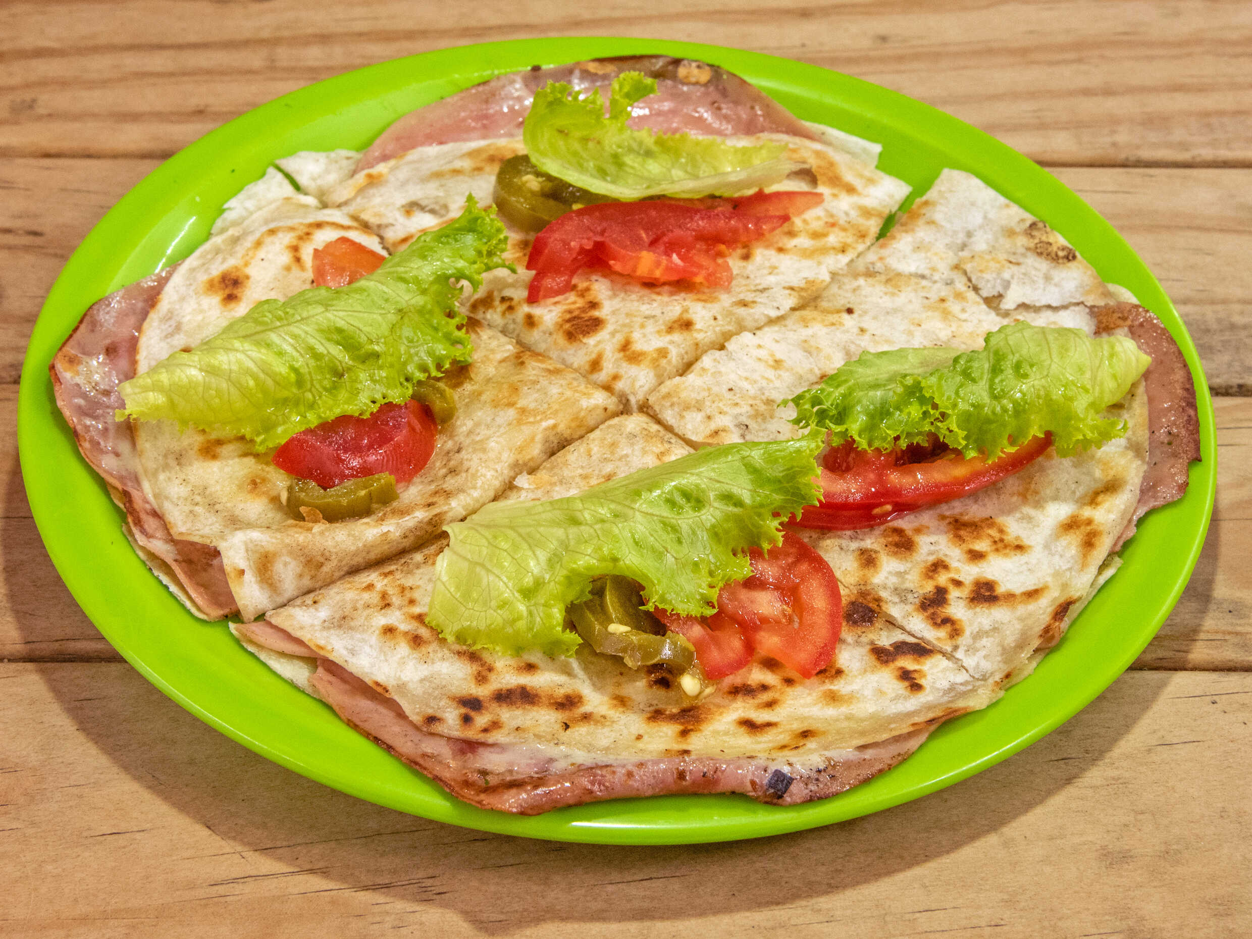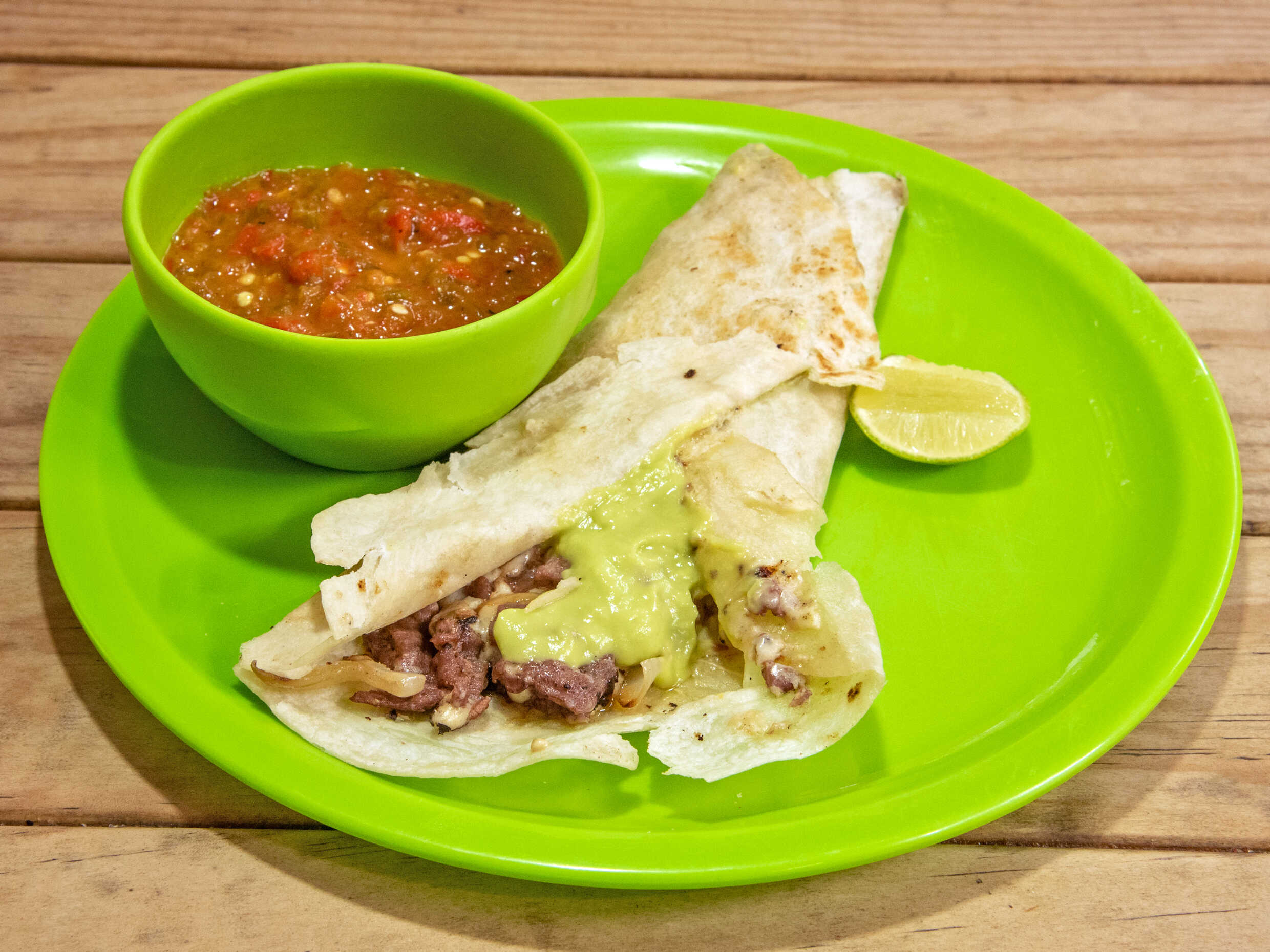 Elige la carne, lleva cebolla asada, salsa, tortilla de harina, queso oaxaca y aguacate.