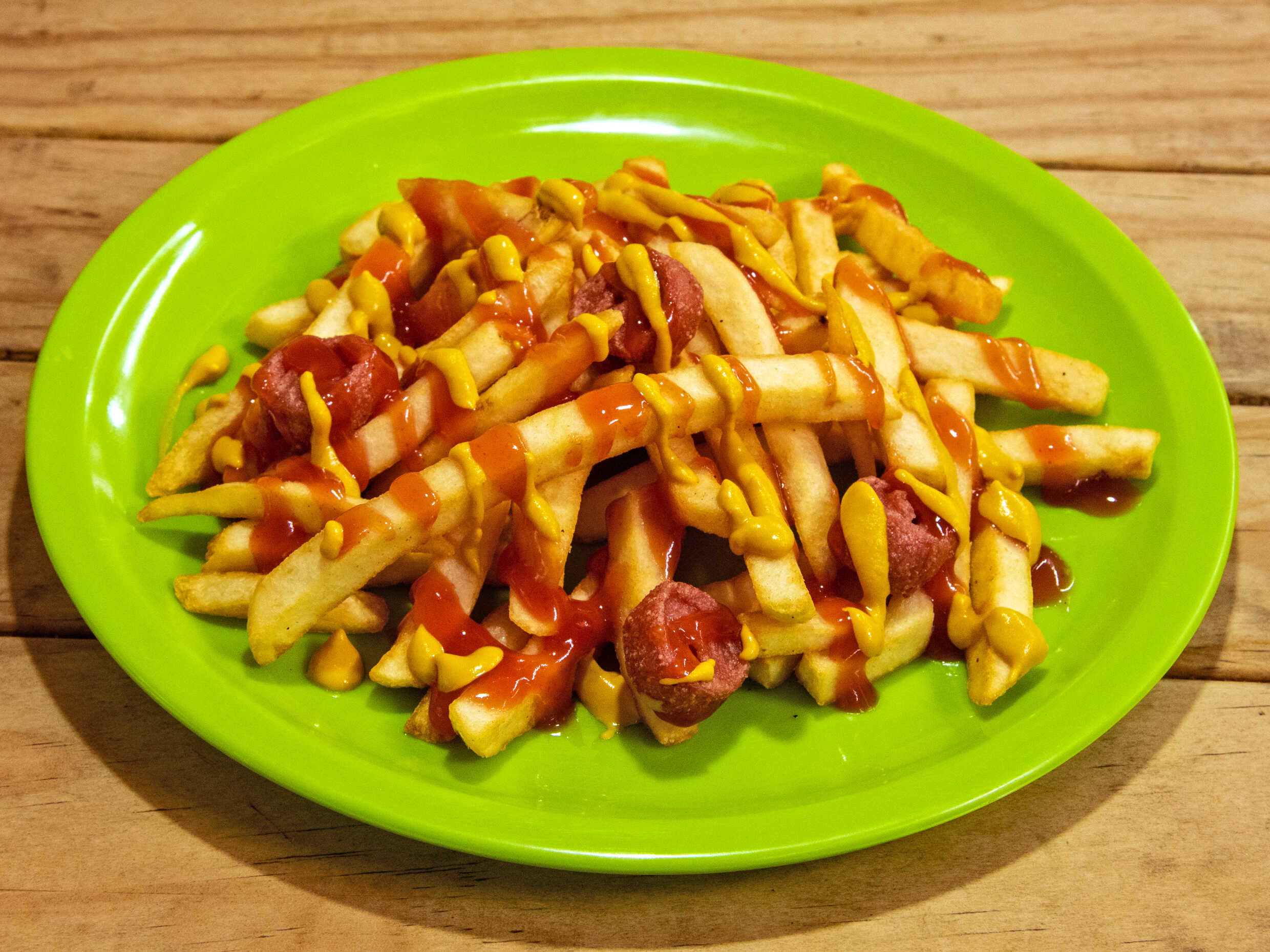 Lleva cátsup, crema, mostaza, valentina y salchicha.