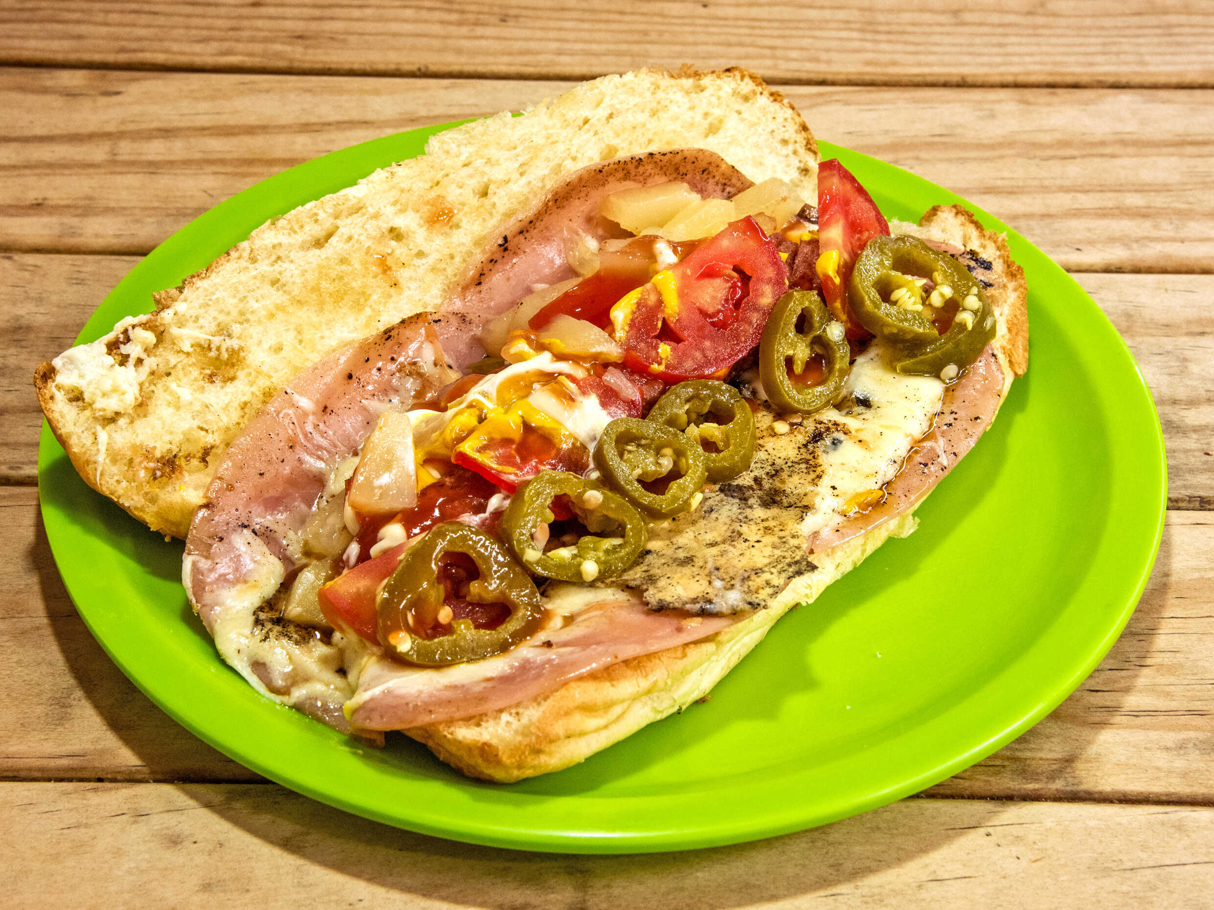 Elige el tamaño llevan jamón, queso amarillo, queso oaxaca, jitomate, piña, chiles, lechuga, mayonesa, cátsup y mostaza.