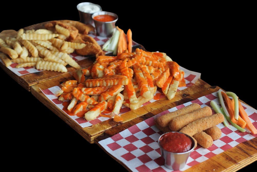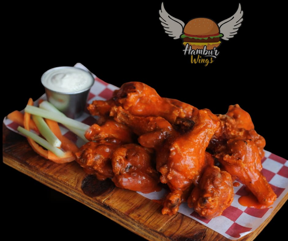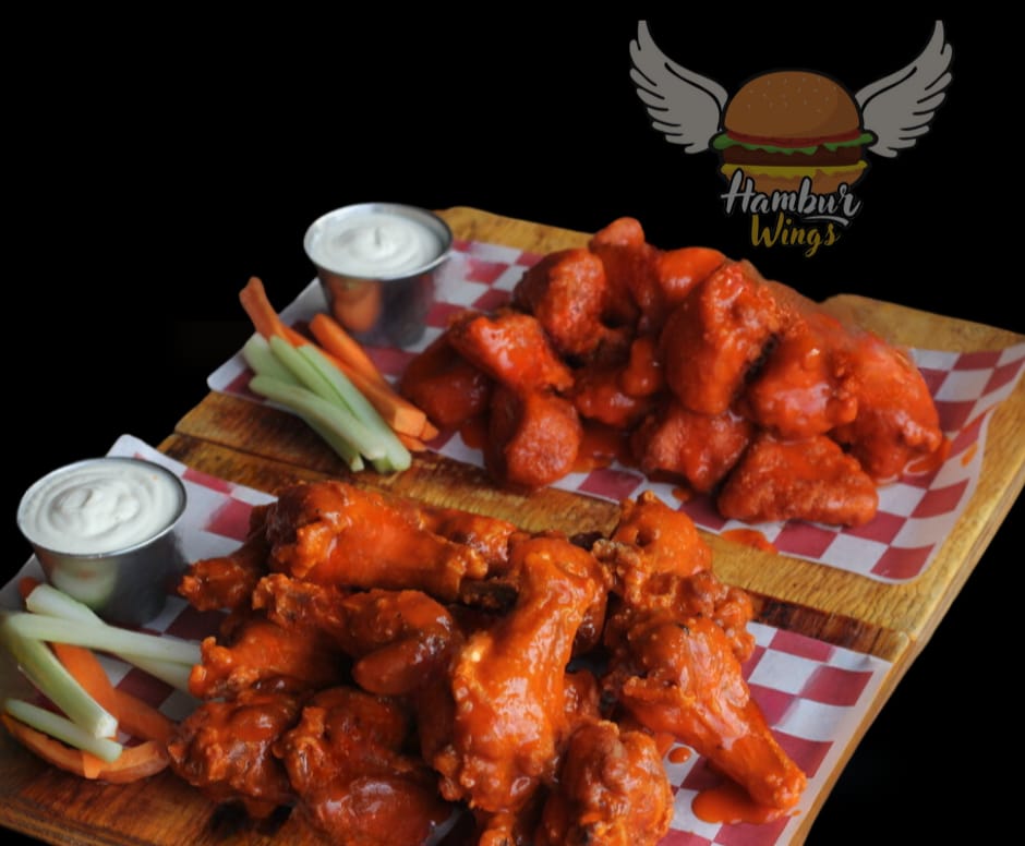 salsa a elegir: Ajo Parmesano , Bbq , Bufalo , Mango Habanero, Lemon Pepper, o combinados con Zanahorias apio y aderezo ranch