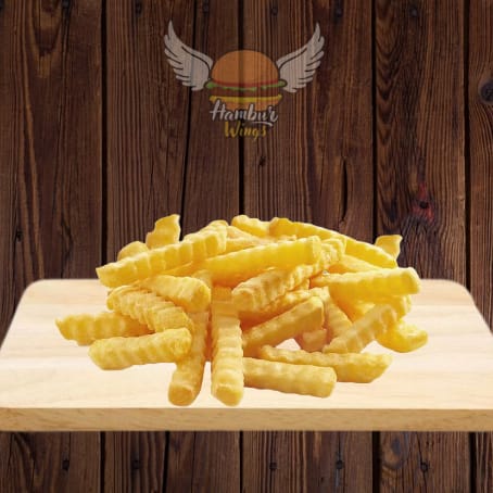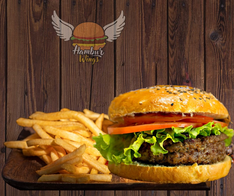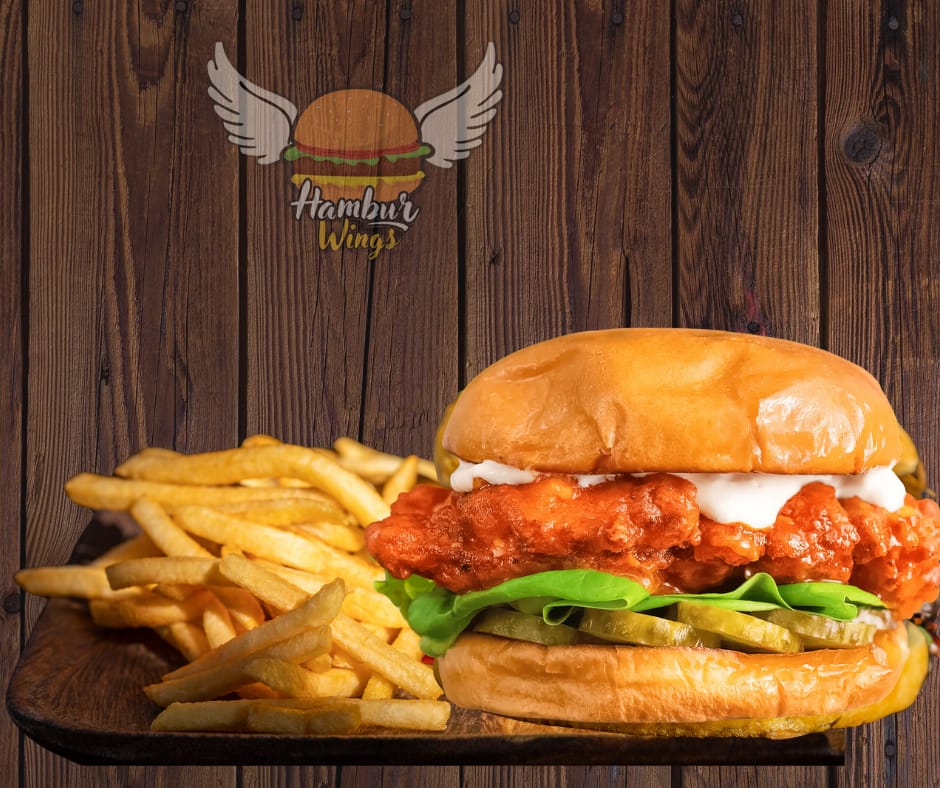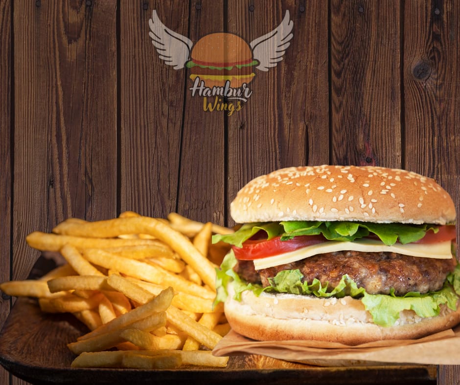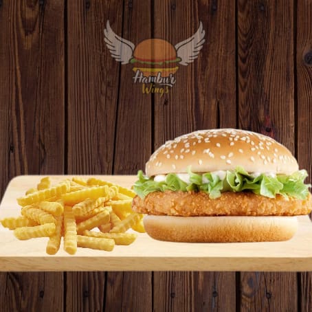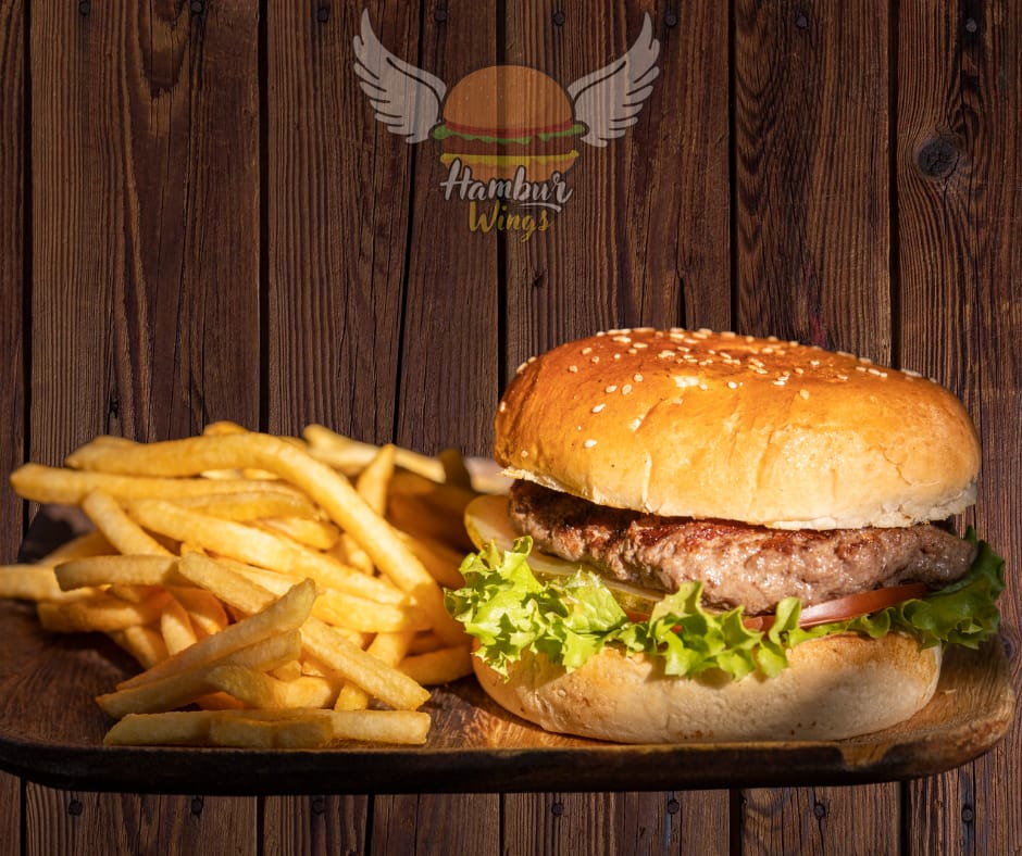Hamburguesa de boneless, salsa a elegir, lechuga, jitomate, picante, queso, aderezos y 120gr de papas