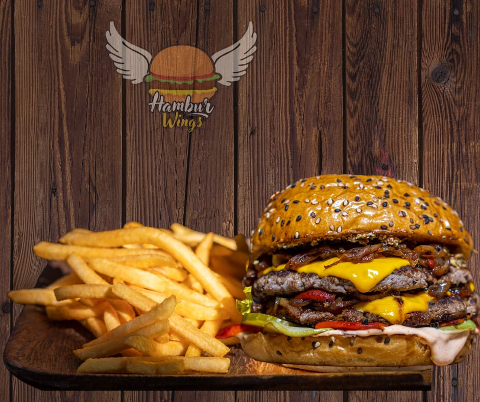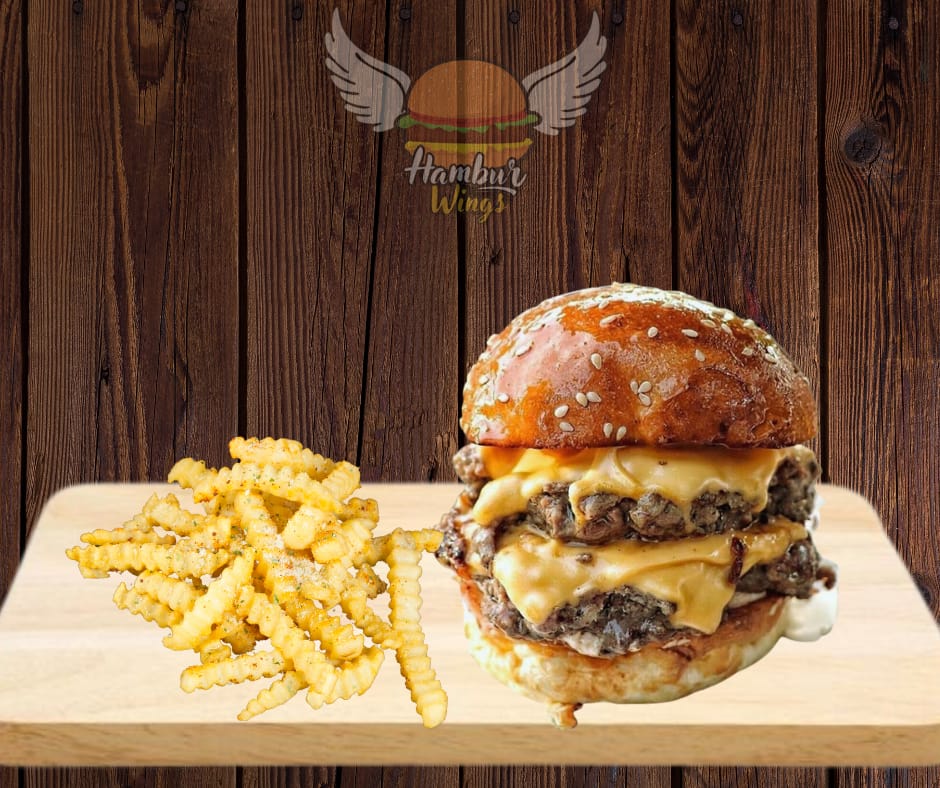 Doble carne de 140gr,cada una lechuga, jitomate, picante, tocino, queso, aderezos y 120gr de papas
